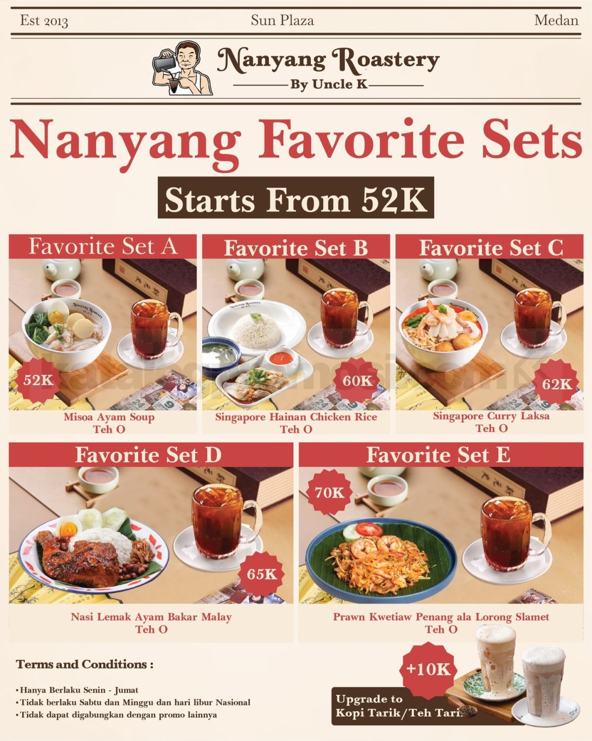• Tersedia upgrade minuman ke Teh Tarik atau Kopi Tarik dengan tambahan Rp. 10.000