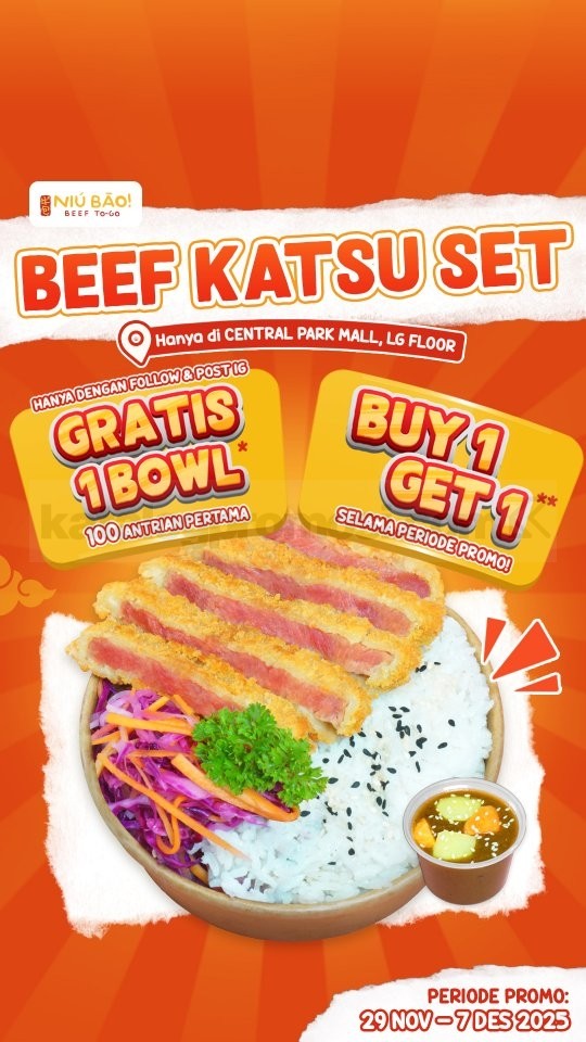 Promo Niu Bao Beef Katsu Set, GRATIS 1 bowl & Buy 1 Get 1 Free dengan curry sauce +Rp. 7.000, berlaku 29 November – 7 Desember 2025 di Central Park Mall
