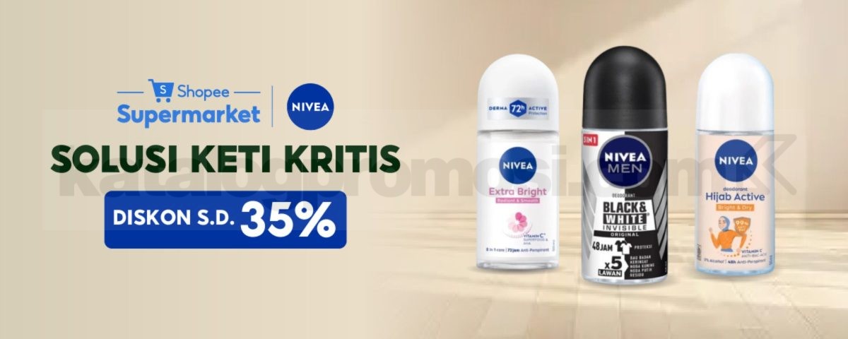 Promo Nivea Shopee Supermarket Deodorant Diskon 35% hemat hingga 35% untuk perawatan ketiak lebih percaya diri dengan produk Nivea Deodorant di Shopee Supermarket berlaku 14 April 2026 – 30 April 2026.