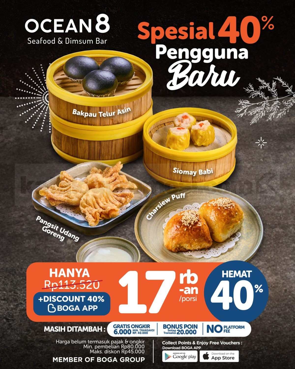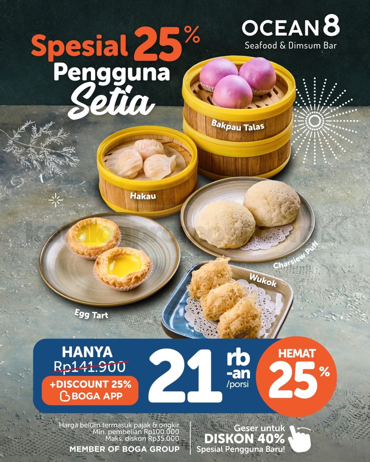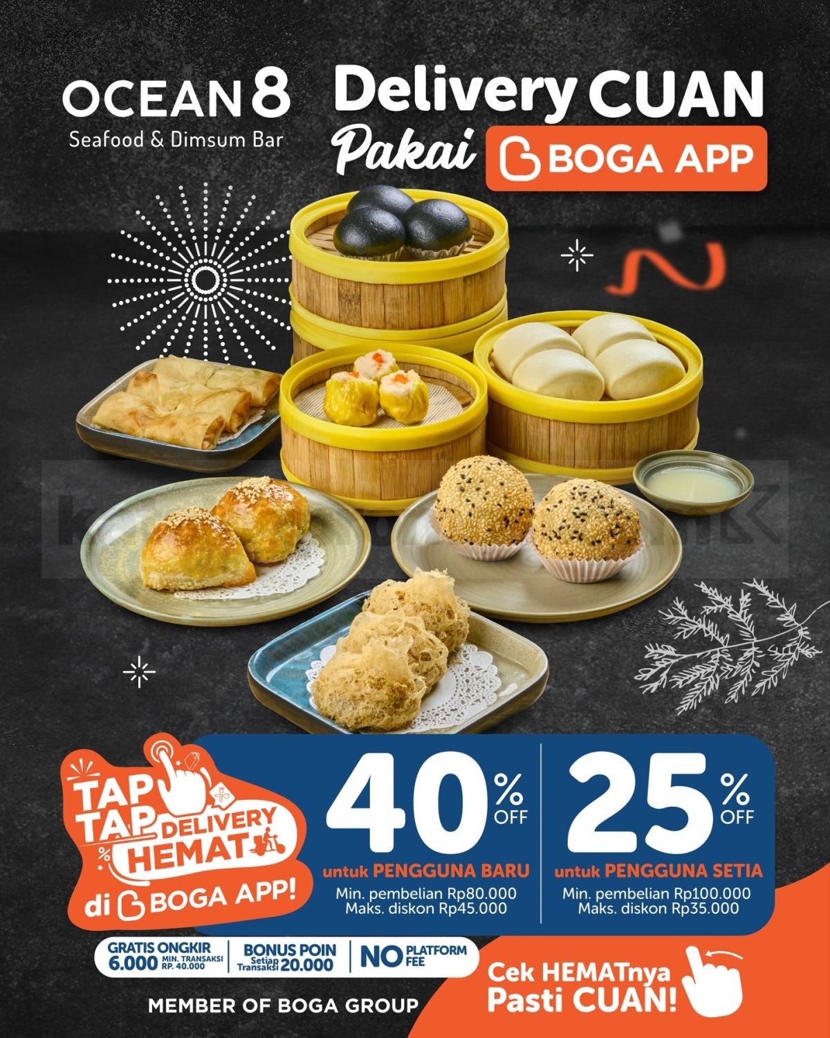 Promo Ocean 8 Delivery Cuan Diskon hingga 40% via BOGA App berlaku selama persediaan masih ada, tersedia pilihan menu dimsum lengkap mulai belasan ribu.