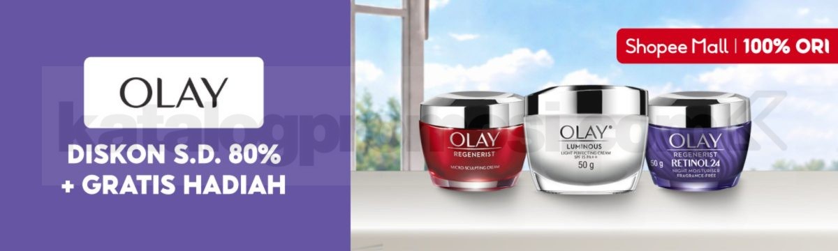Promo diskon hingga 80% untuk produk skincare Olay di Shopee dengan tambahan hadiah gratis untuk pembelian tertentu.