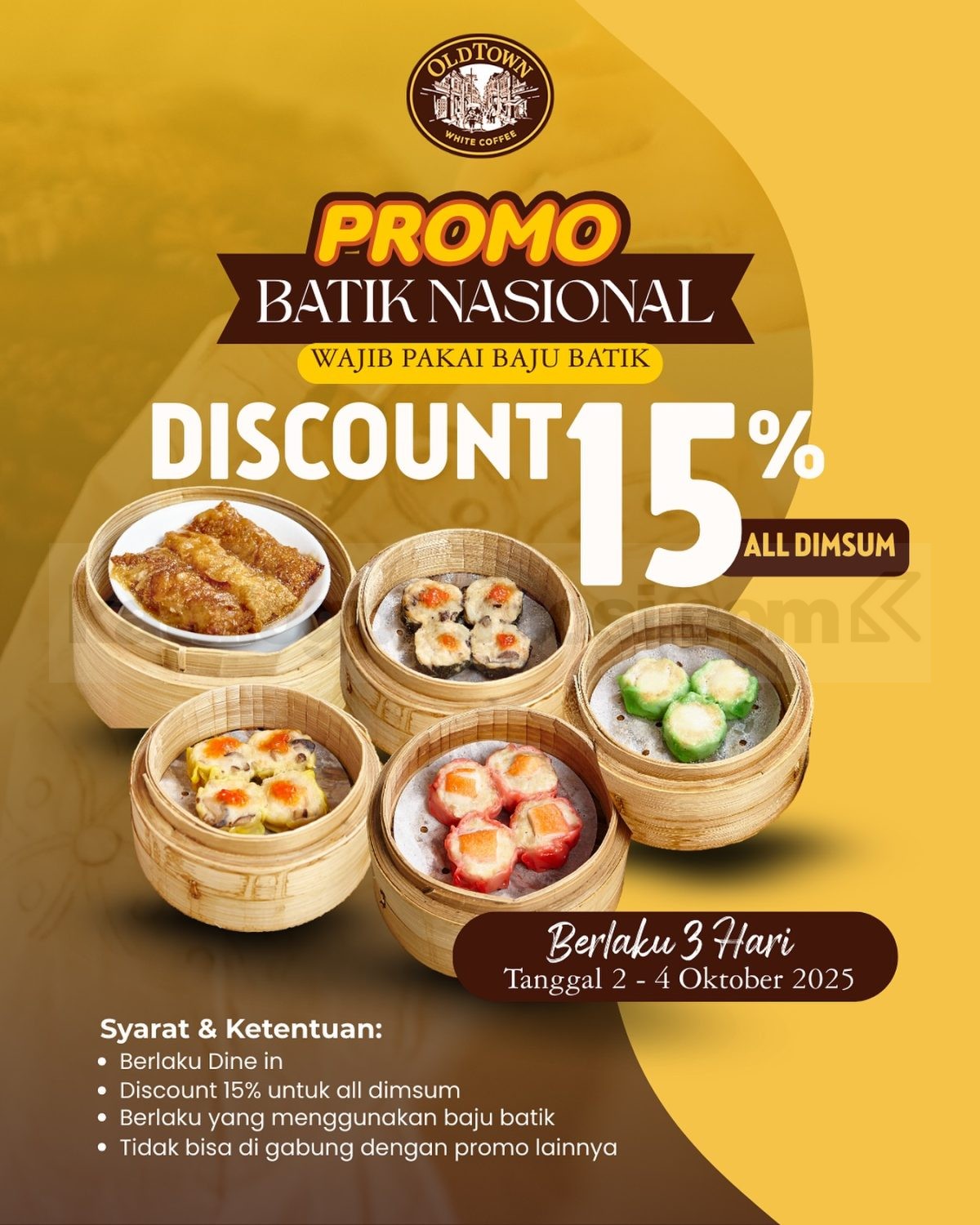 Promo Old Town White Coffee Batik Nasional Diskon 15% untuk Semua Dimsum cuma 3 hari aja dari tanggal 2-4 Oktober 2025.