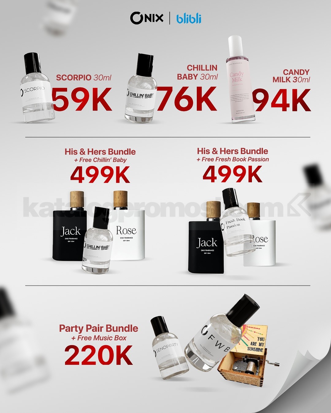 - Hadiah parfum atau music box diberikan untuk pembelian bundle.