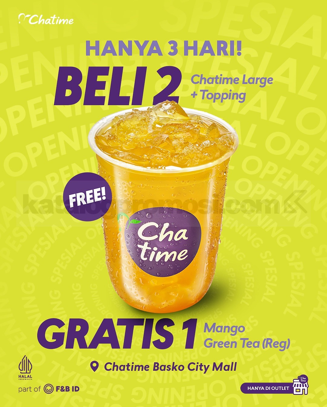 Promo Chatime Opening Basko City Mall Padang, beli 2 Chatime Large + topping gratis Mango Green Tea Reg, berlaku 3 hari saja.