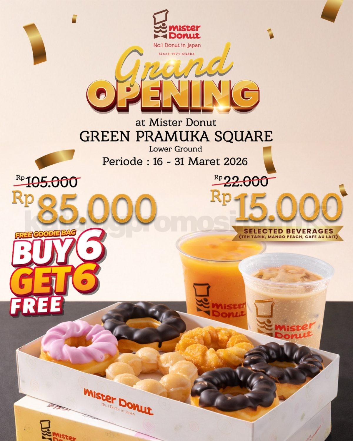 Promo Mister Donut Opening Green Pramuka Square beli 6 gratis 6 donut Rp. 85.000 dan selected beverages Rp. 15.000 berlaku mulai tanggal 16 Maret 2026 – 31 Maret 2026 di Green Pramuka Square Jakarta.