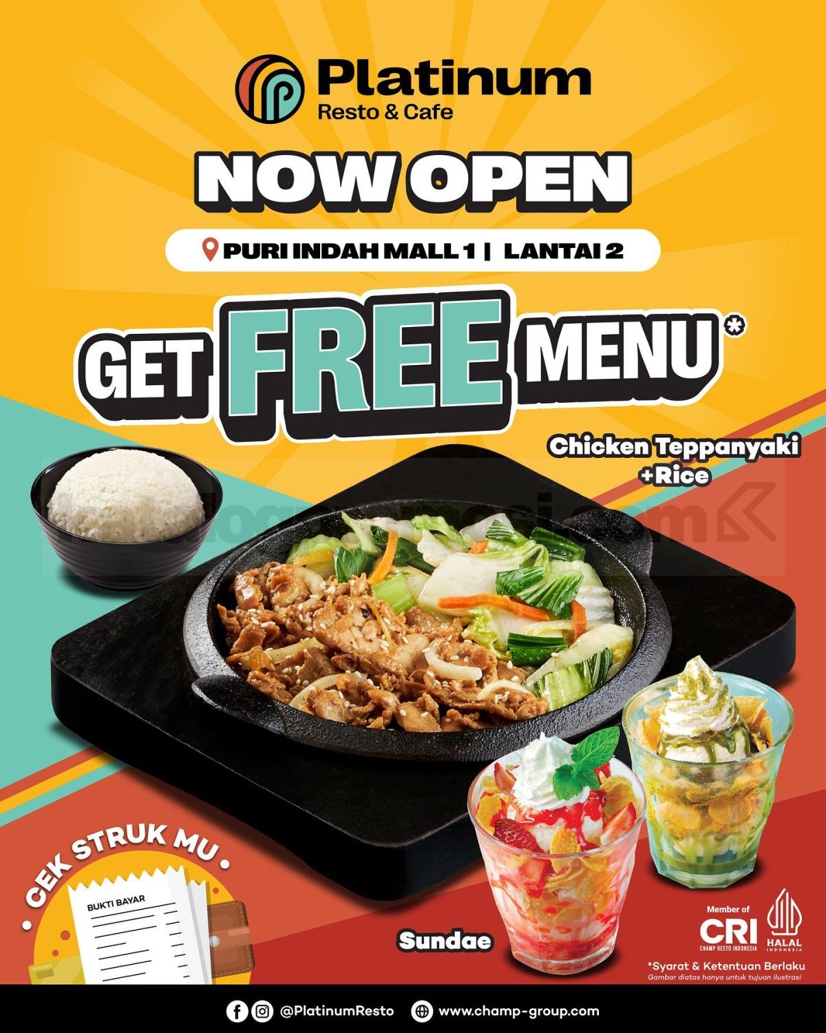 Jangan sampai kelewatan kesempatan seru ini buat makan enak bareng keluarga dan teman. Langsung aja ke Platinum Resto & Cafe lantai 2 Puri Indah Mall dan nikmati promo opening yang super menarik ini!