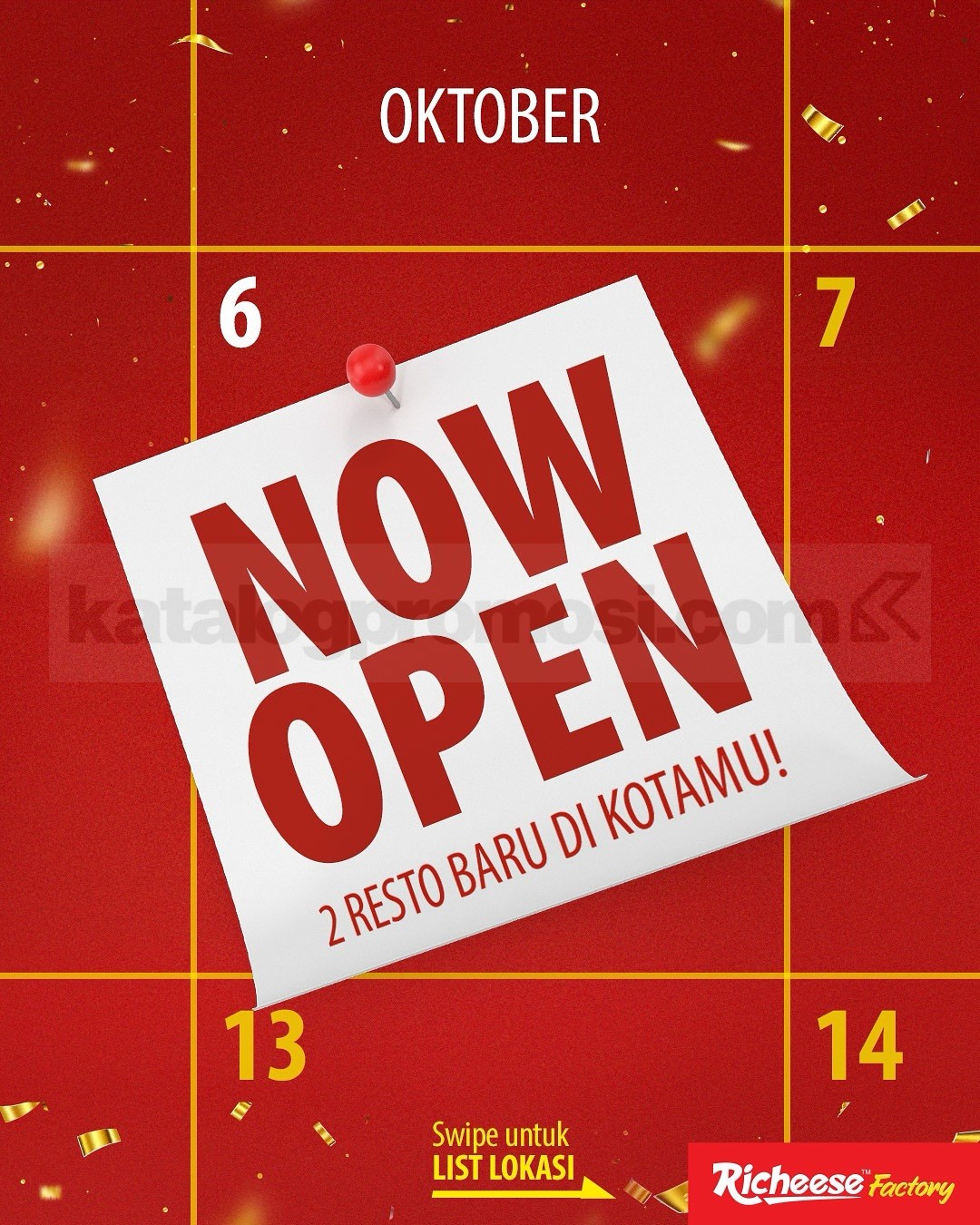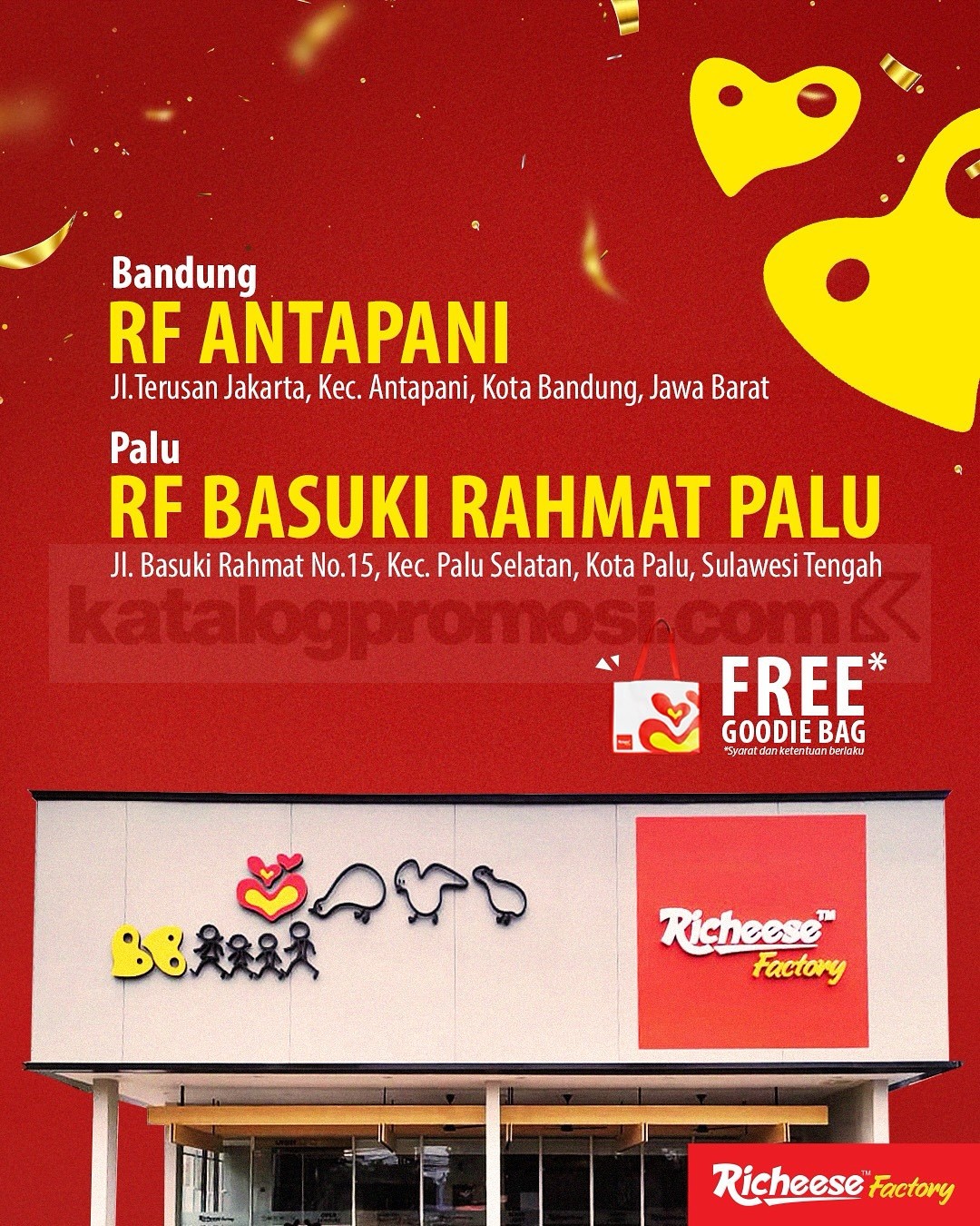 Yuk, sambut minggu ini dengan promo Opening Richeese Factory Free Merchandise di Bandung dan Palu! Sekarang kamu bisa nikmatin menu favorit di Richeese Factory Antapani Bandung dan Basuki Rahmat Palu sambil dapetin merchandise resmi Richeese Factory secara GRATIS! 🎉✨