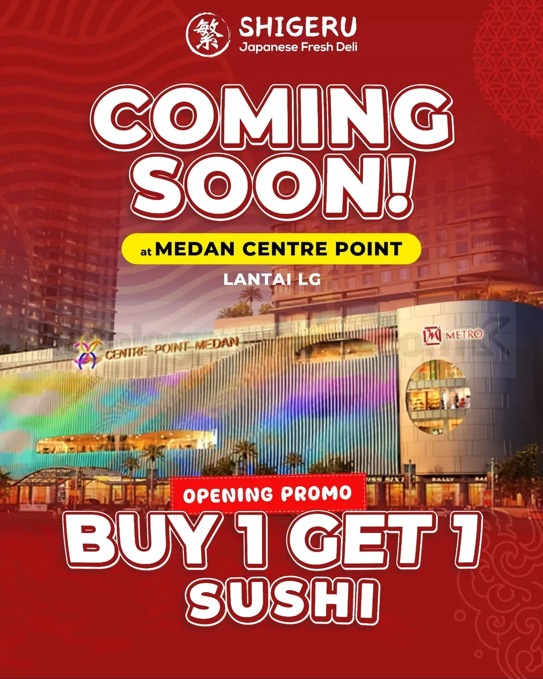 HORAS, Medan! ๐ Ada kabar seru nih buat para pecinta sushi. Shigeru akhirnya siap-siap buka store baru di Centre Point Medan dan pastinya bawa kejutan mantep: Promo Shigeru Buy 1 Get 1 Sushi. Opening store emang gak lengkap tanpa promo, jadi kali ini kamu bisa makan sushi double tapi bayar cuma sekali aja. Promo opening ini berlaku mulai 4 September sampai 18 September 2025.