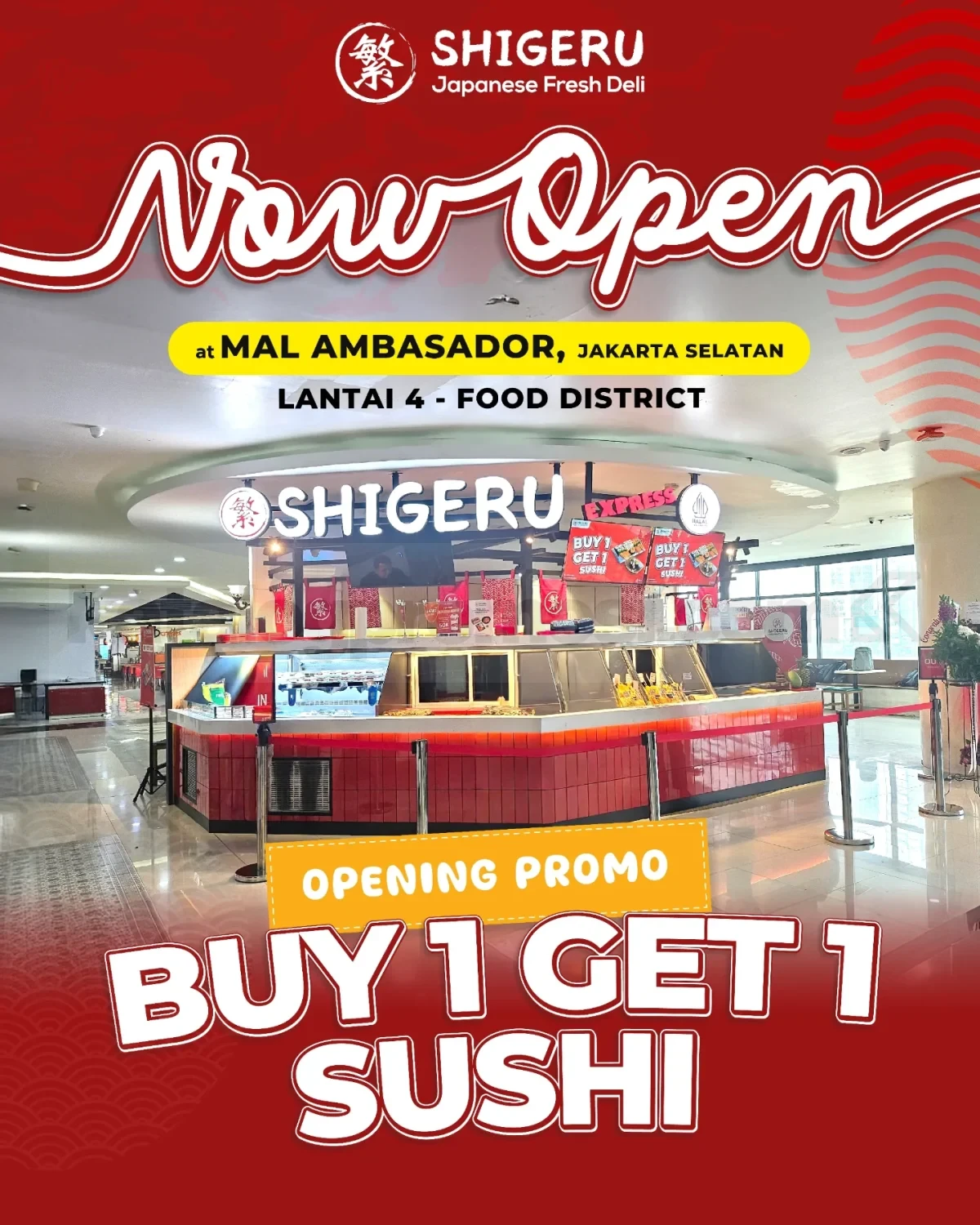 Yuk buruan ke Shigeru Mal Ambasador lantai 4, dan jangan sampai ketinggalan Promo Opening Shigeru Mal Ambasador Buy 1 Get 1 Sushi yang cuma ada sampe 24 September 2025! Sushinya udah nungguin kamu โ tinggal ajak temen, pesen, dan makan enak rame-rame! ๐ฃ๐ฅ