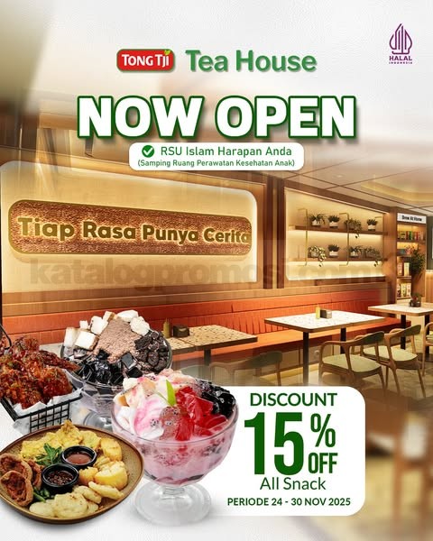 Promo Opening Tong Tji Tea RSI Harapan Anda Tegal Diskon 15% Off* untuk Semua Cemilan & Dessert, berlaku hingga 30 November 2025.