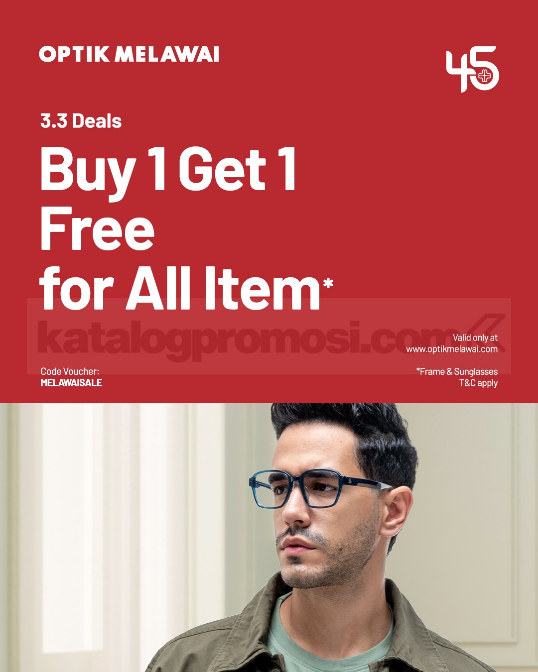 Promo Optik Melawai 3.3 Deals Beli 1 Gratis 1 frame dan sunglasses dengan kode MELAWAISALE berlaku mulai tanggal 1 Maret 2026 – 4 Maret 2026 di optikmelawai.com