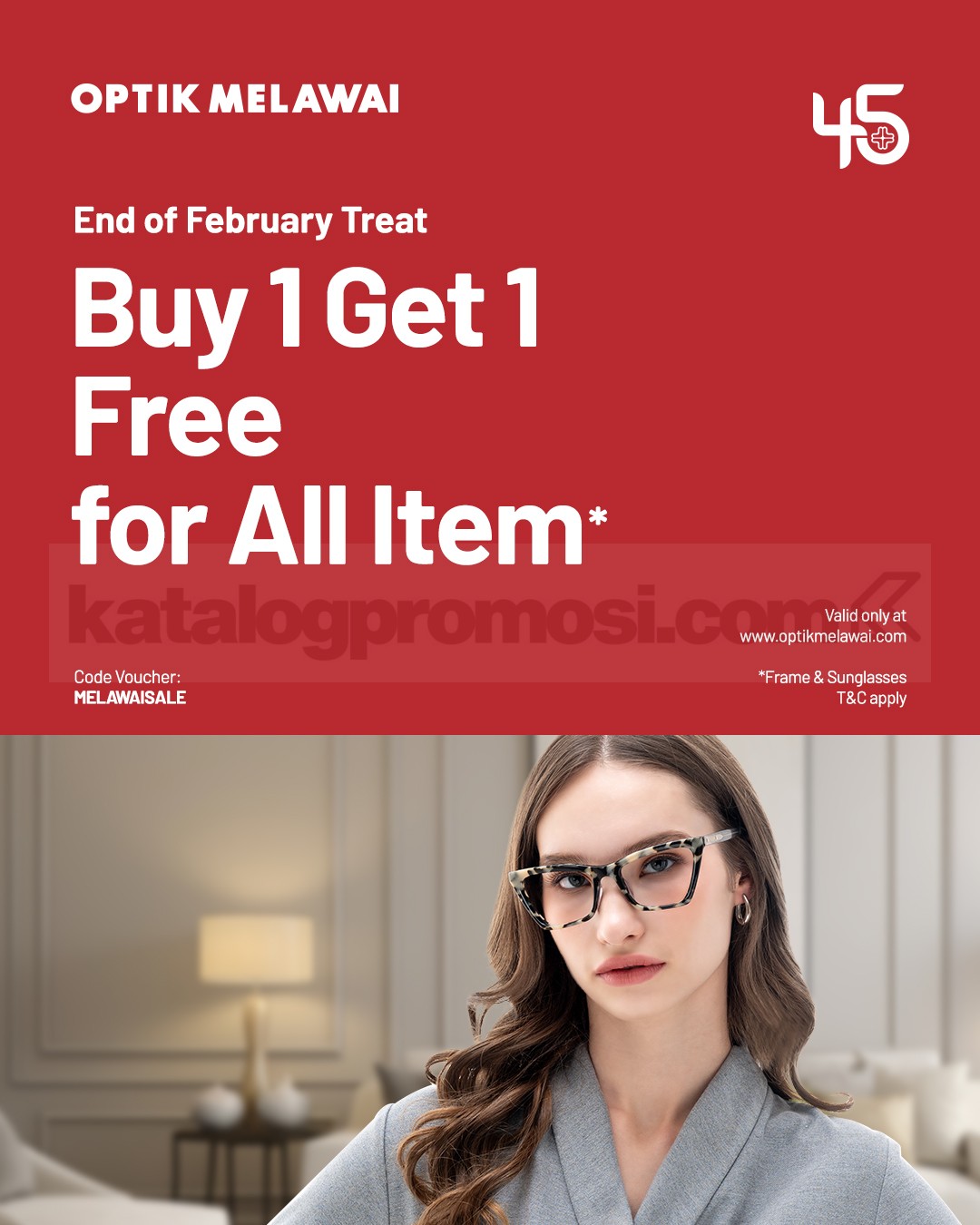 Promo Optik Melawai Buy 1 Get 1 Free frame dan sunglasses berlaku hingga 28 Februari 2026 eksklusif di optikmelawai.com.