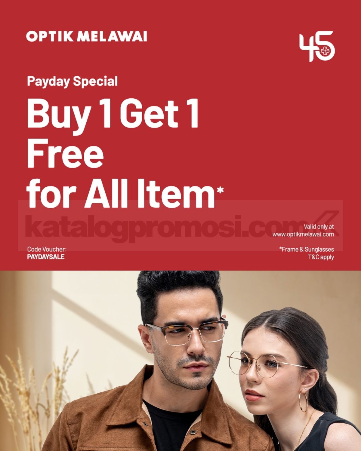 Nikmati Promo Optik Melawai Payday Buy 1 Get 1 Free untuk mendapatkan dua kacamata sekaligus dengan harga lebih hemat.