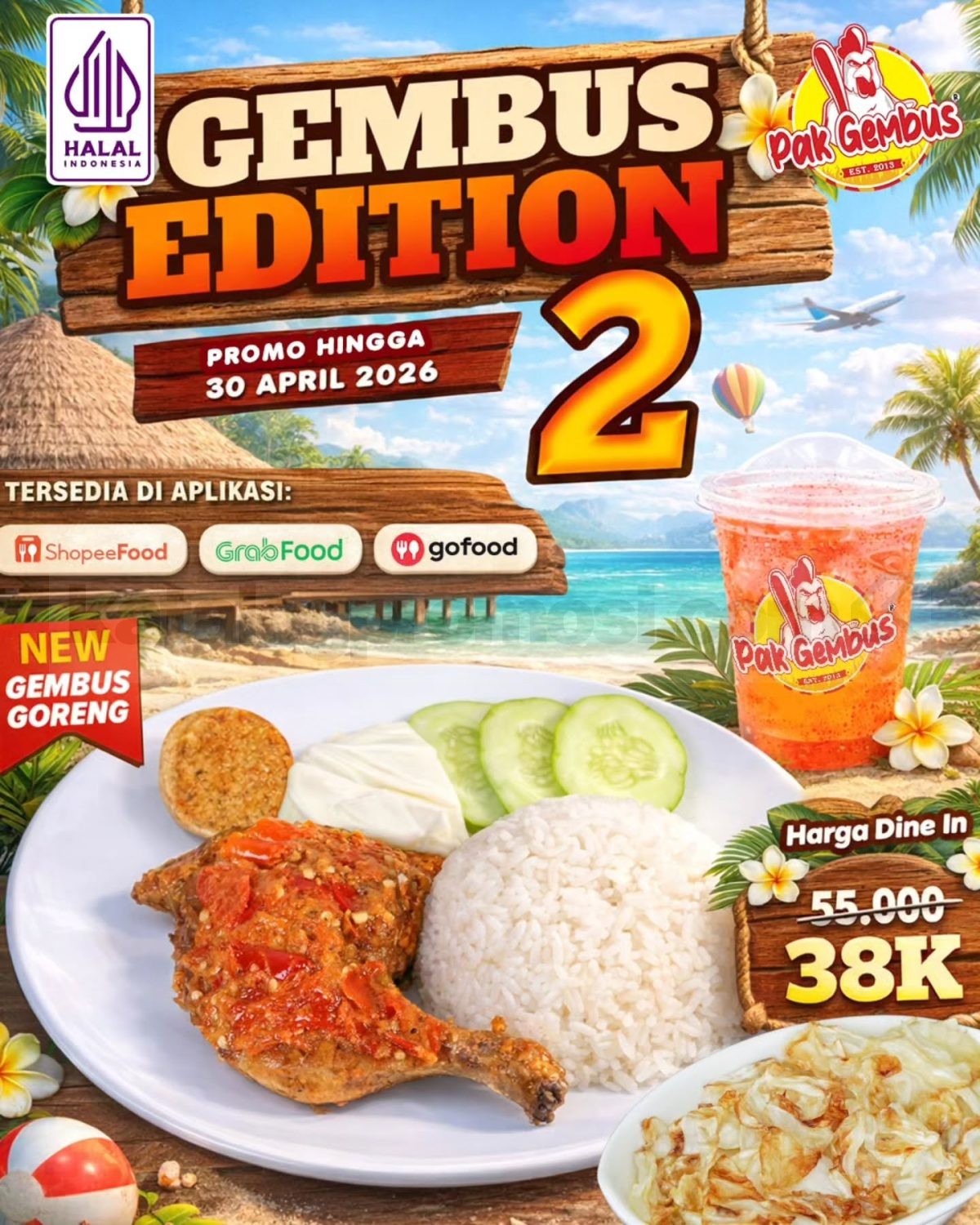 Promo Pak Gembus Paket Gembus Edition 2 Rp. 38.000 paket ayam sambal lengkap lebih hemat berlaku hingga tanggal 30 April 2026 untuk dine in dan delivery.