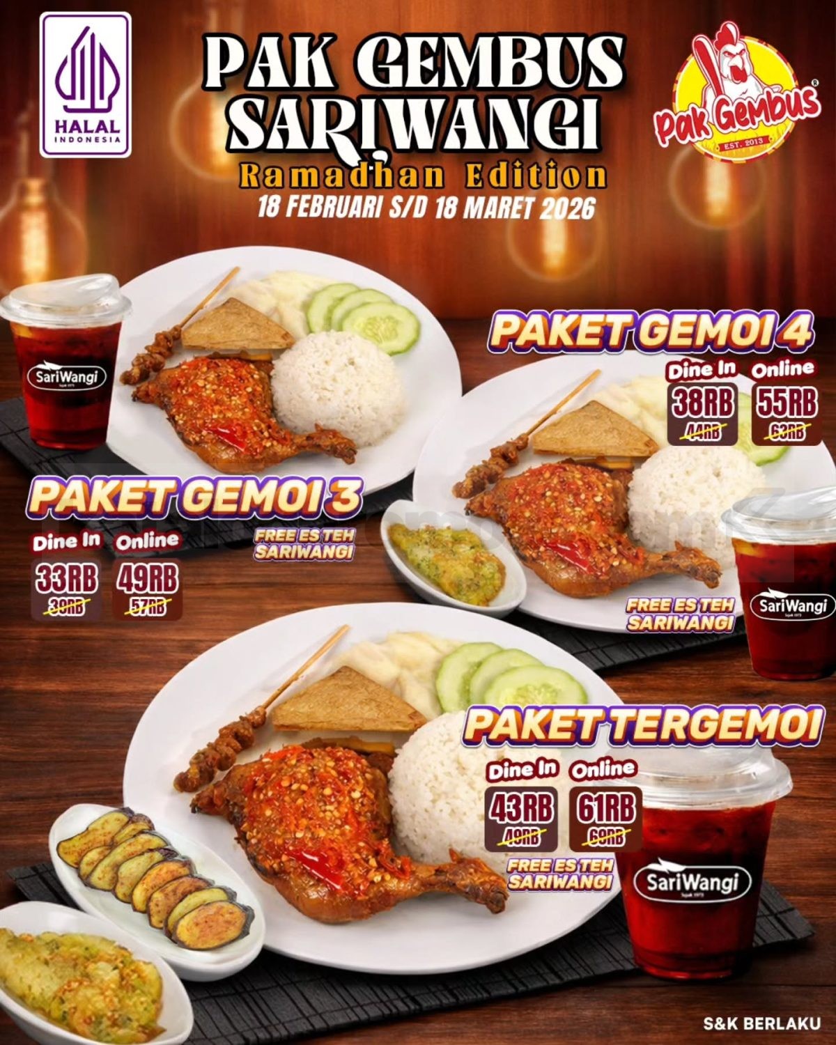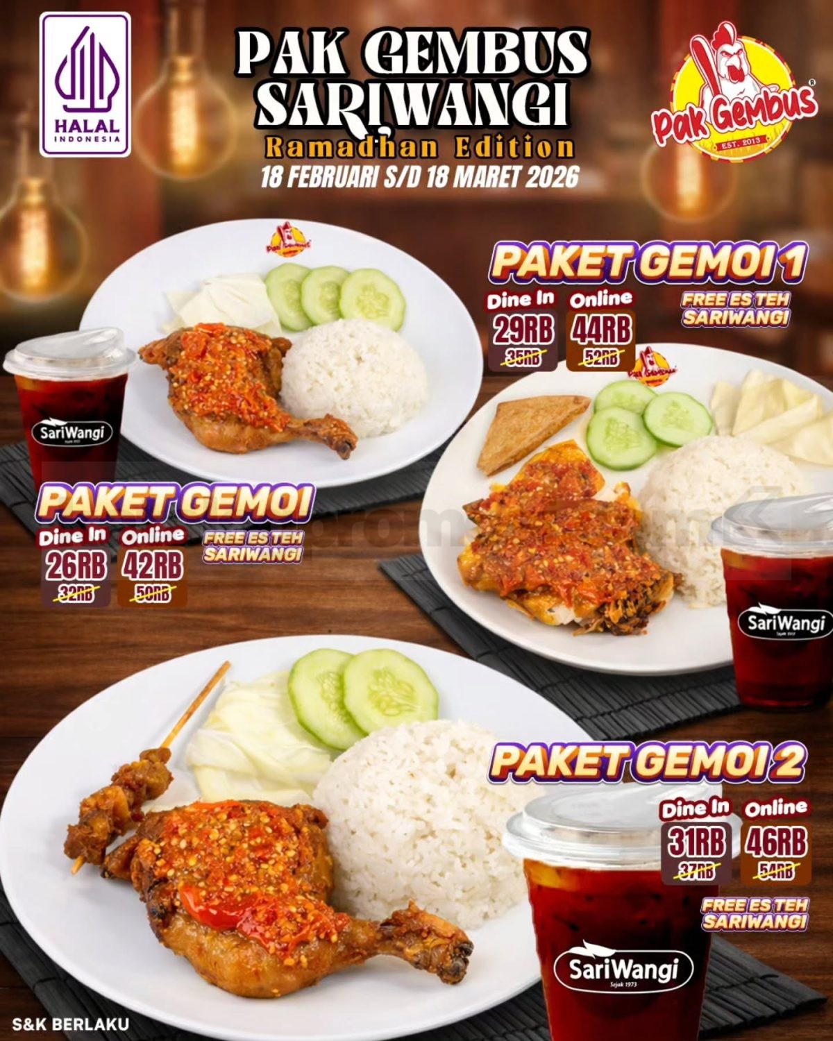 Manfaatkan Promo Pak Gembus Sariwangi Paket Gemoi mulai Rp. 26.000 untuk pengalaman buka puasa yang lebih hemat dan menyegarkan sebelum periode berakhir.