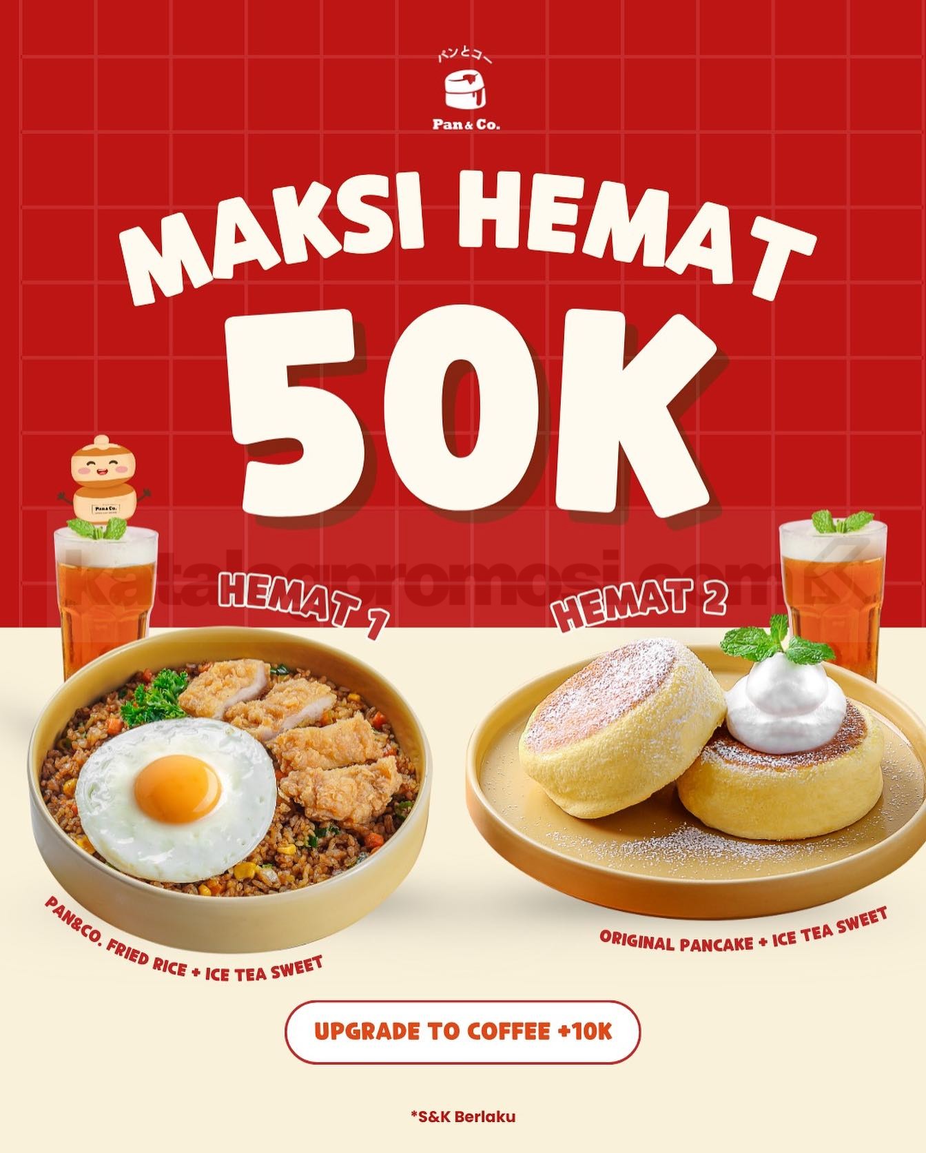 Di promo ini, kamu bisa pilih salah satu dari dua paket hemat yang udah include makanan dan minuman. Mulai dari nasi goreng ala Pan&Co. sampai pancake original yang fluffy dan lembut banget! Dan yang bikin makin spesial, kamu juga bisa upgrade minuman ke Pan&Co. Latte (hot/cold) cuma nambah 10K aja! Worth it banget buat kamu yang pencinta kopi โโจ