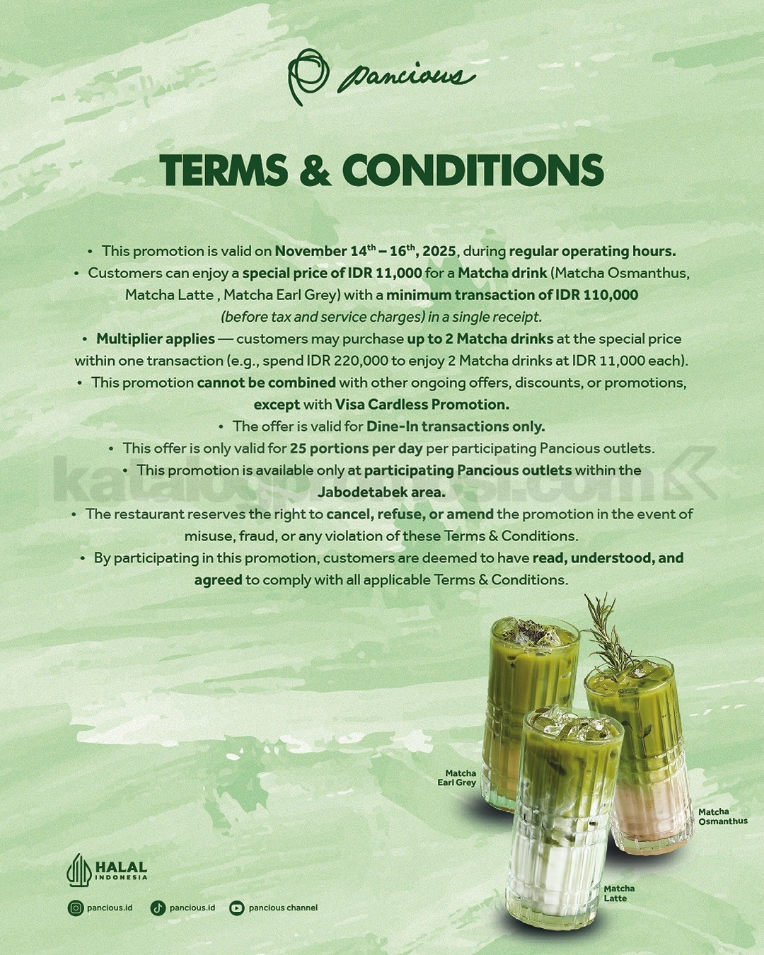 Mumpung lagi blessing Friday, jangan sampai kelewatan nikmatin Ceremonial Matcha favoritmu cuma dengan Rp.11.000! Promo ini cuma berlaku di beberapa outlet Pancious, jadi pastikan mampir ke lokasi terdekat kamu.