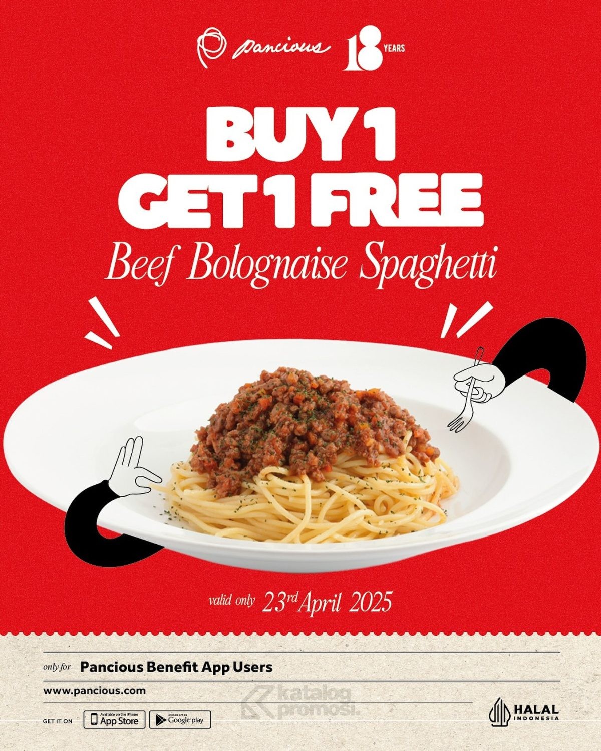 Kalau kamu pengguna Pancious Benefit App, promo satu hari ini sayang dilewatkan. Tinggal datang, pesan menu yang ditentukan, dan nikmati dua piring pasta sekaligus dalam satu momen.