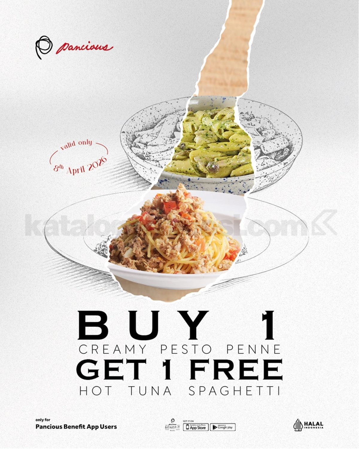 Promo Pancious Buy 1 Get 1 Pasta beli Creamy Pesto Penne gratis Hot Tuna Spaghetti berlaku 8 April 2026 di lokasi tertentu.