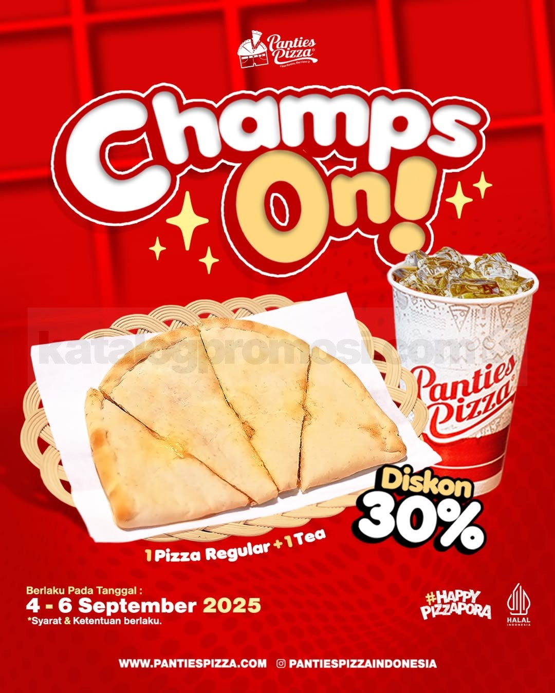 Promo Panties Pizza Hari Pelanggan Nasional diskon 30% untuk 1 pizza regular + 1 tea, berlaku 4โ6 September 2025.