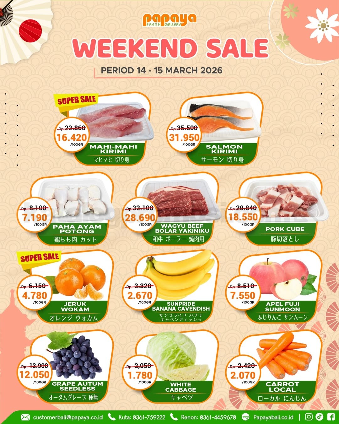 Halo, Fresh Buddy! Weekend ini waktunya belanja hemat di Papaya Bali! Ada Special Weekend Sale yang siap bikin belanja kamu makin nguntungin. Buat kamu yang ada di Bali, jangan lewatkan kesempatan ini buat nyetok barang-barang fresh favoritmu. Persiapkan segala kebutuhan ngumpul bareng keluarga, sahabat, atau orang tersayang. ✨