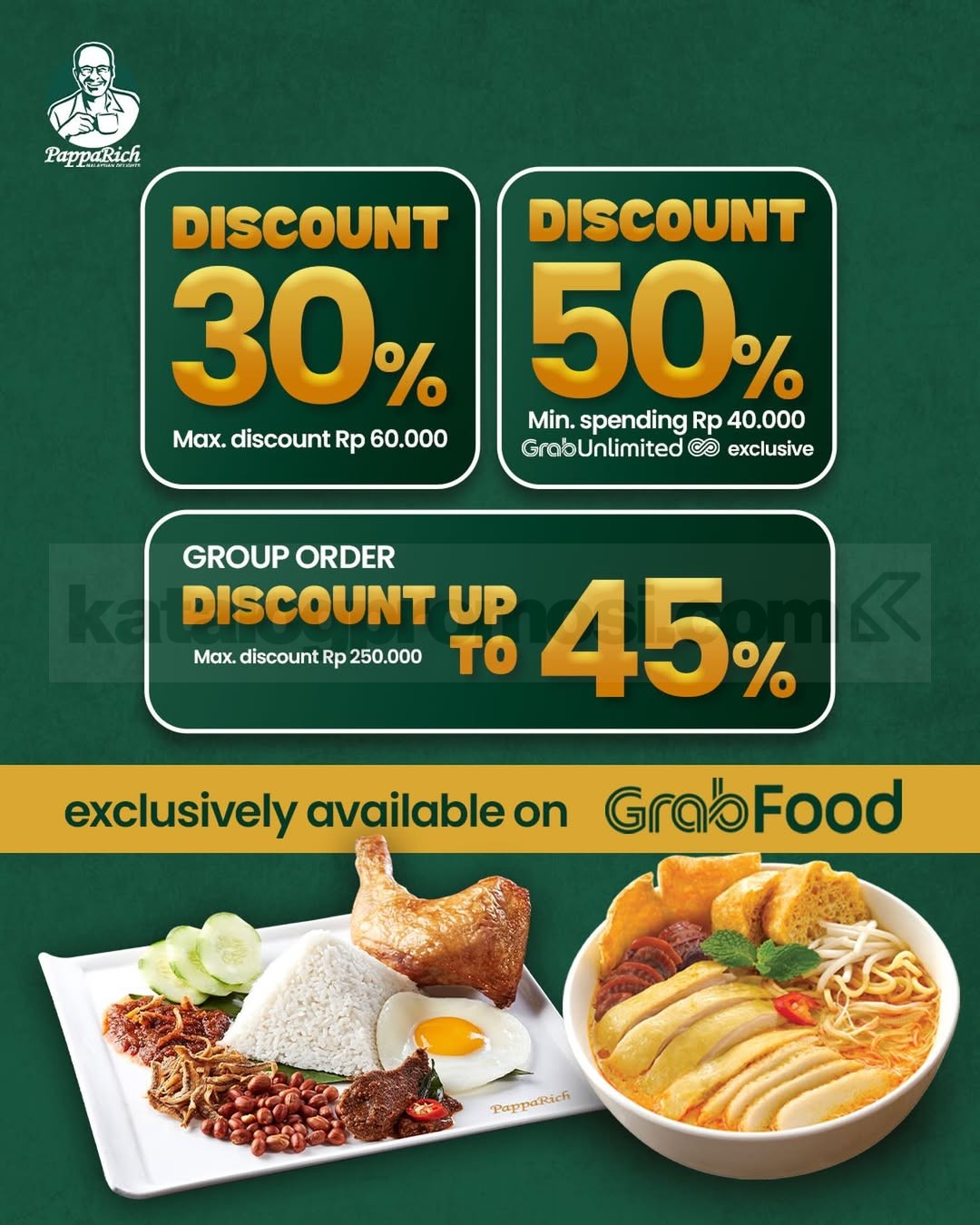 Promo PappaRich GrabFood ini menawarkan beberapa skema diskon menarik yang bisa disesuaikan dengan kebutuhan pesanan. Mulai dari diskon reguler, potongan besar untuk group order, sampai diskon khusus pengguna GrabUnlimited dengan minimum transaksi tertentu.