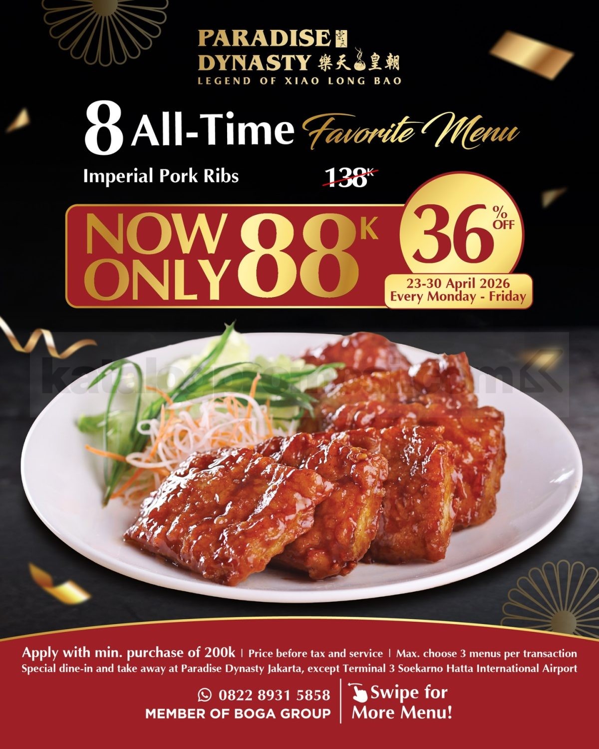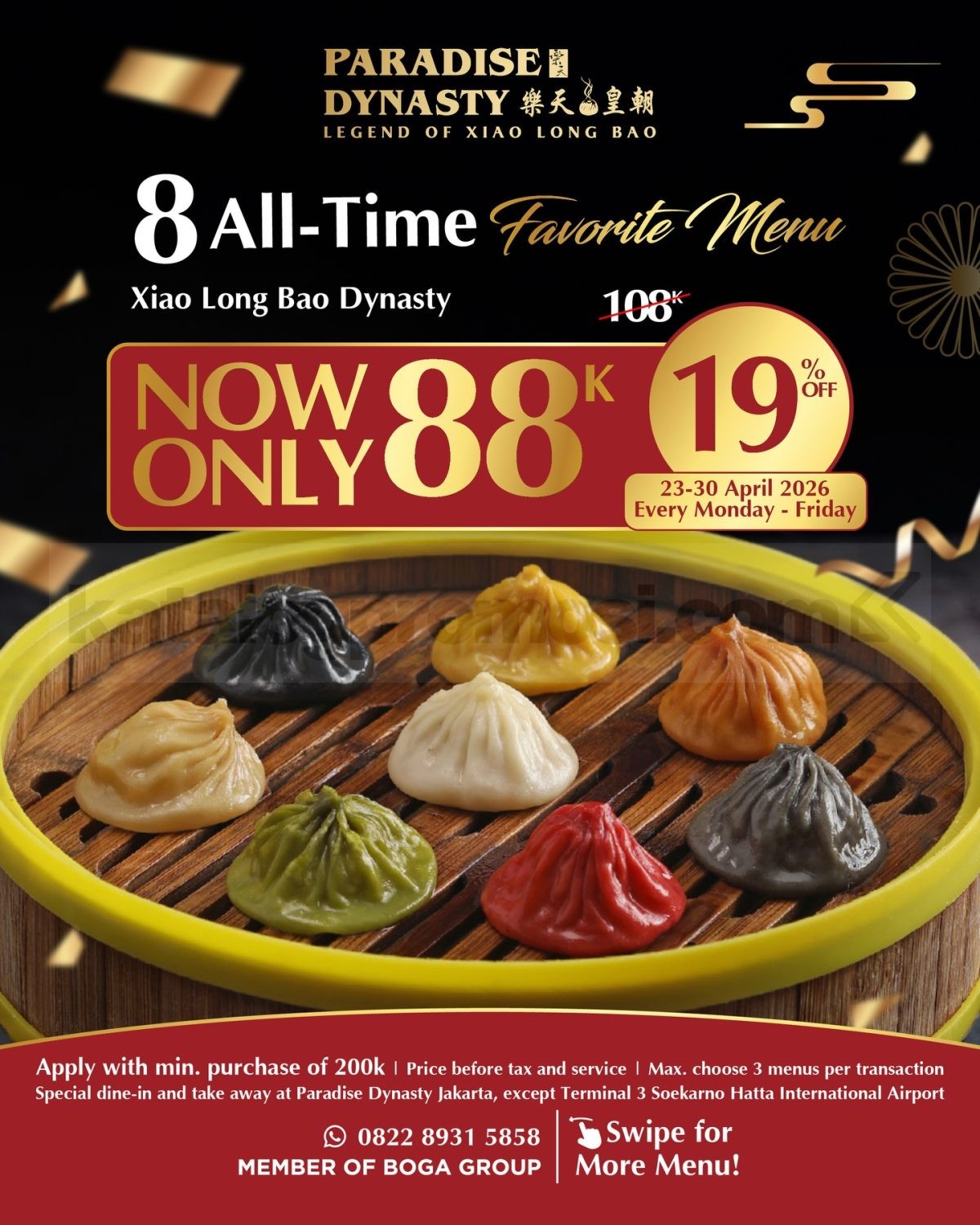 Promo Paradise Dynasty 8 Menu Favorit Rp. 88.000 periode 23 β 30 April 2026 berlaku Senin β Jumat dengan minimum transaksi Rp. 200.000 untuk dine in dan take away di outlet Paradise Dynasty Jakarta kecuali Terminal 3 Soekarno Hatta