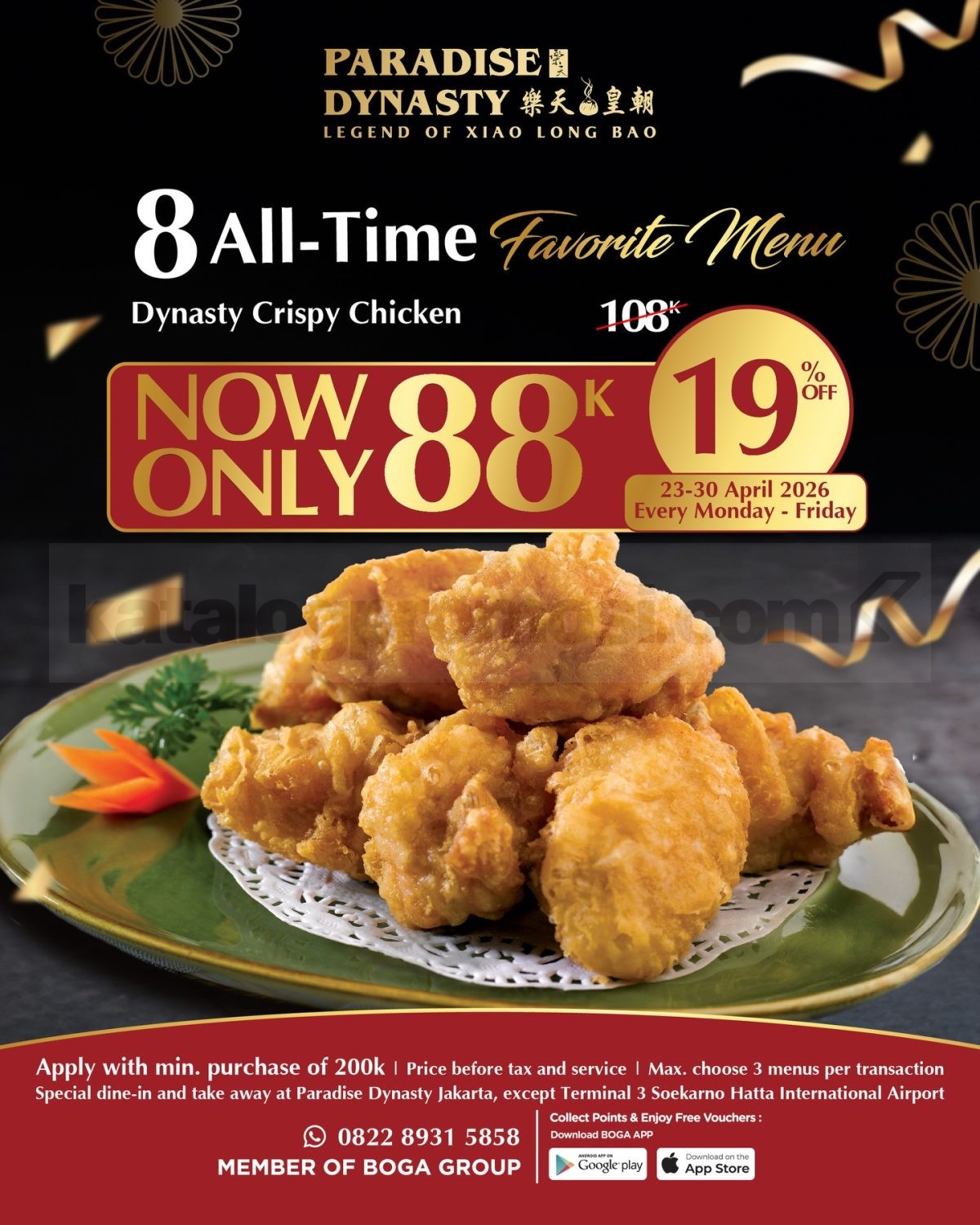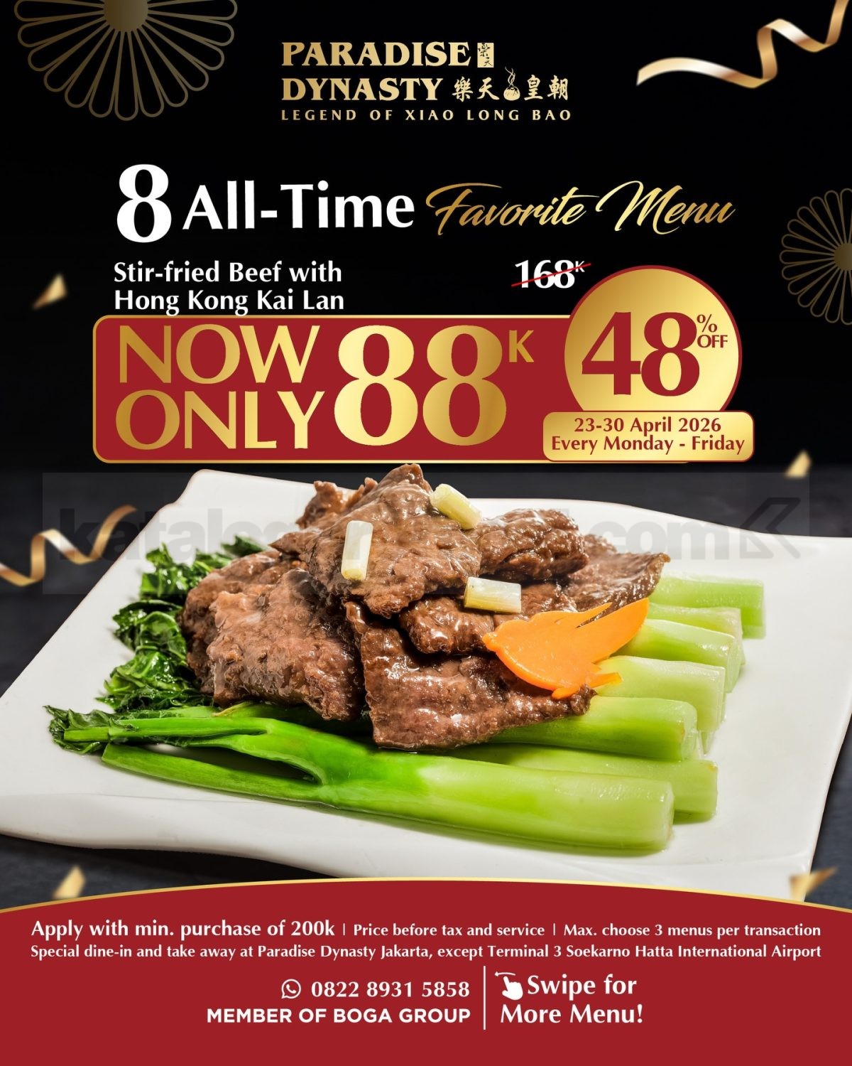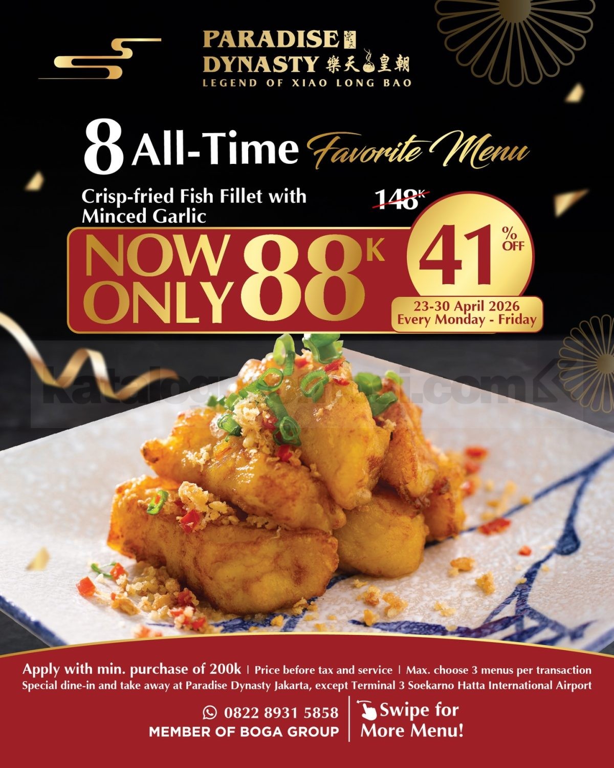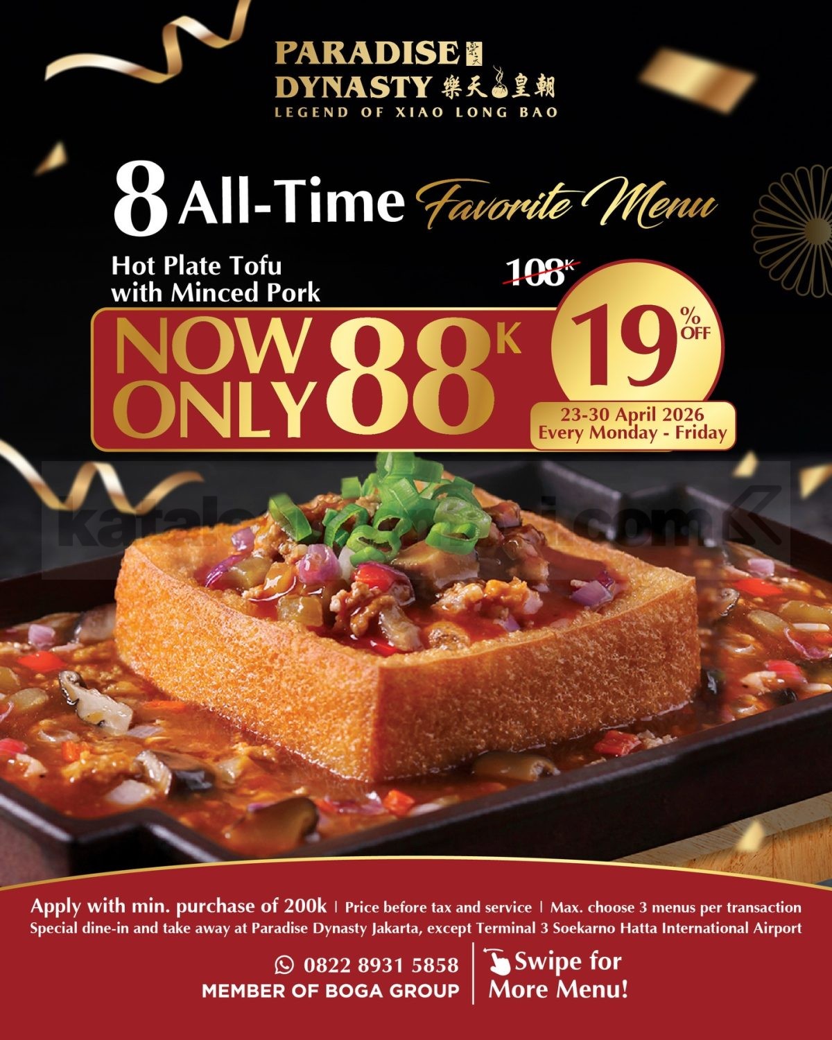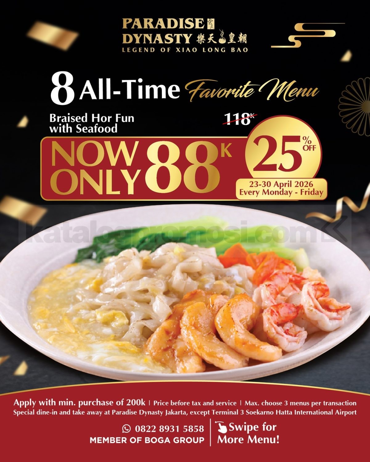 Sekarang ada pilihan menu favorit Paradise Dynasty seharga Rp. 88.000 untuk pembelian menu tertentu selama periode promo berlangsung. Berlaku dengan minimum transaksi Rp. 200.000 dan maksimal pilih 3 menu promo dalam satu transaksi.