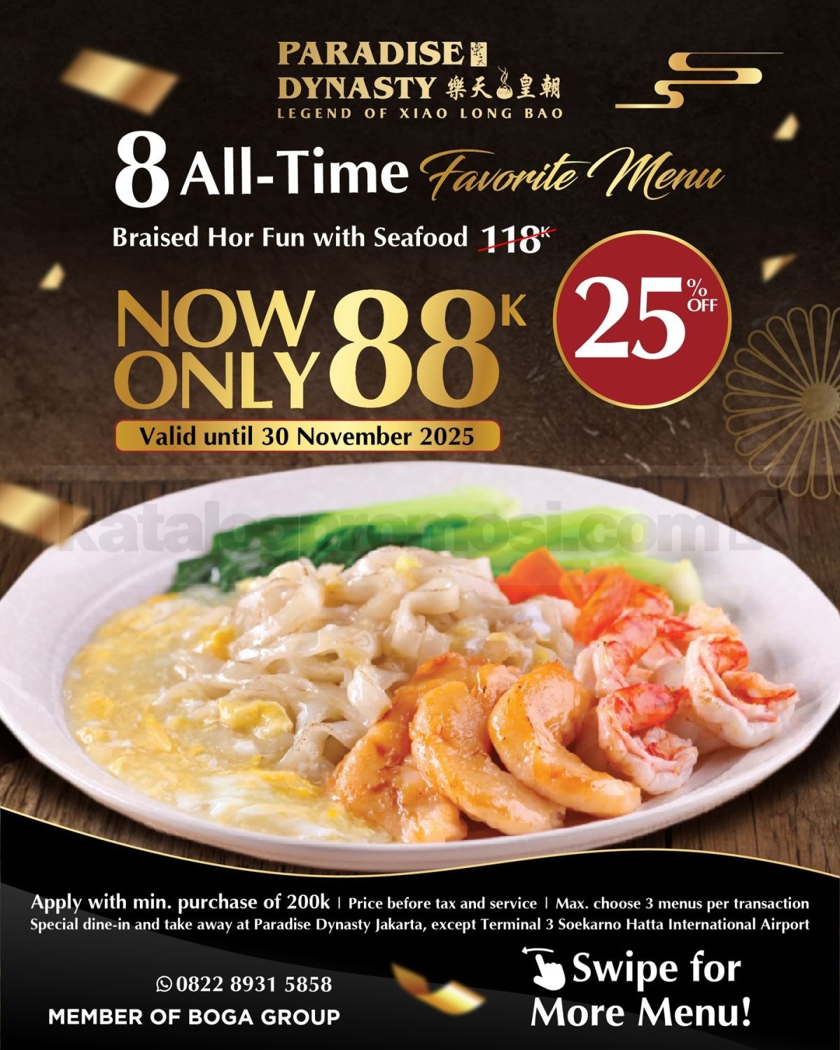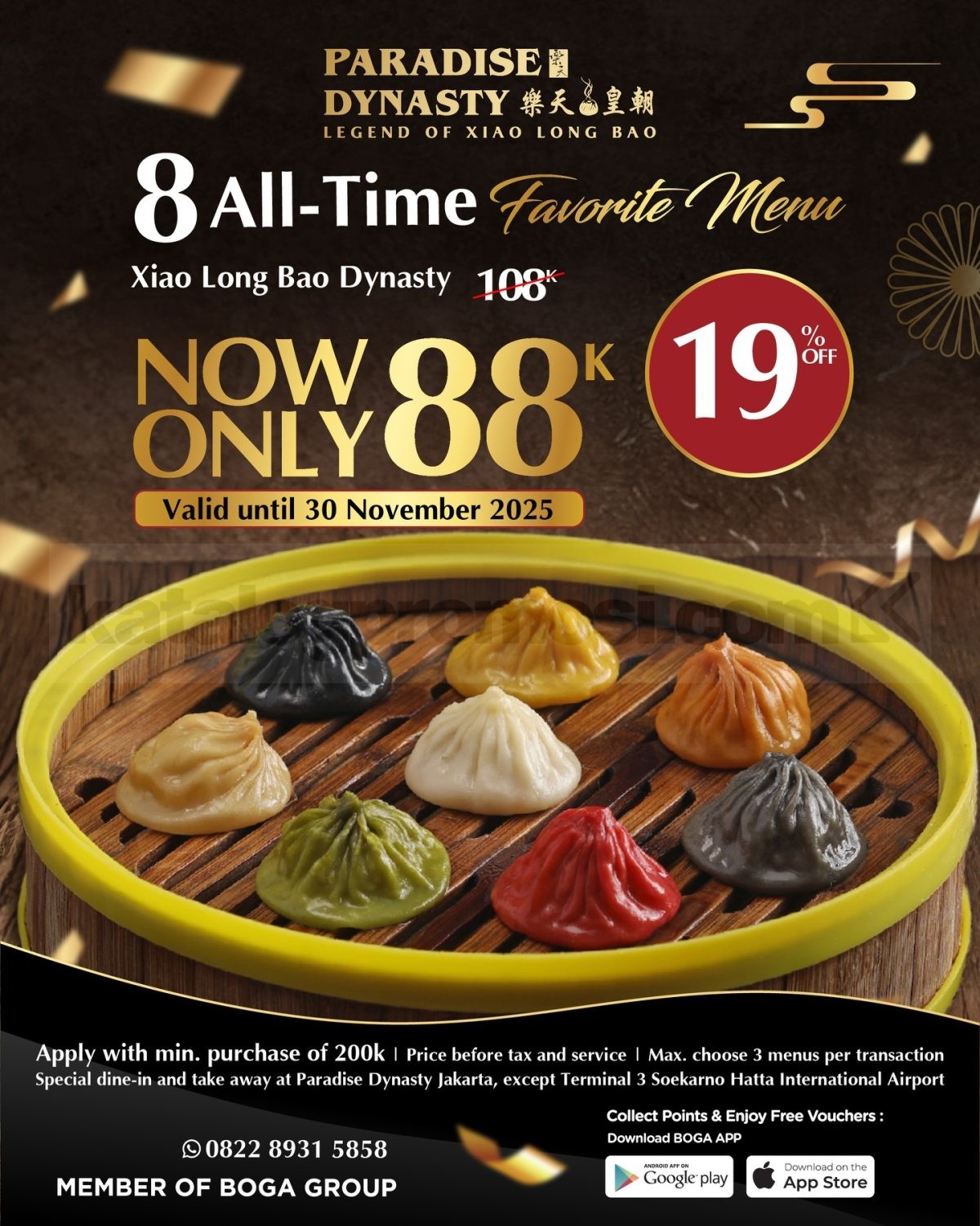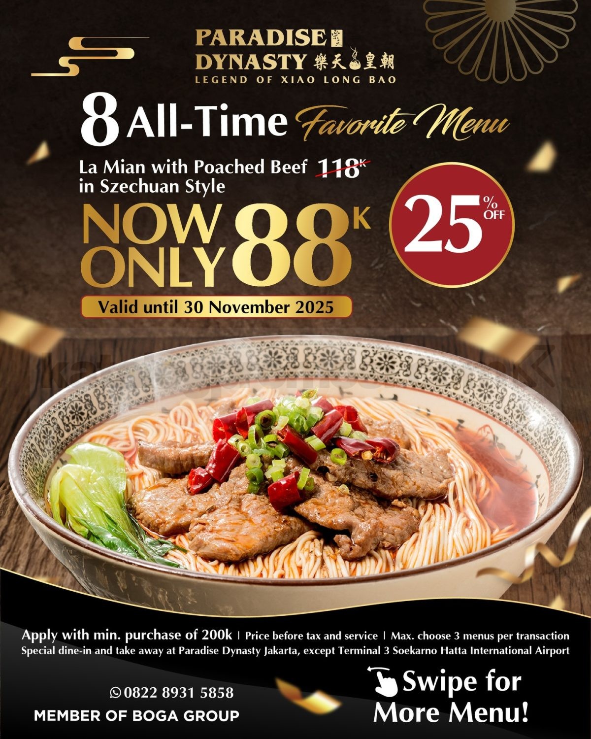 Promo Paradise Dynasty Favorite Menu Rp. 88.000 untuk 8 menu favorit dengan diskon besar, berlaku hingga 30 November 2025 di lokasi tertentu.