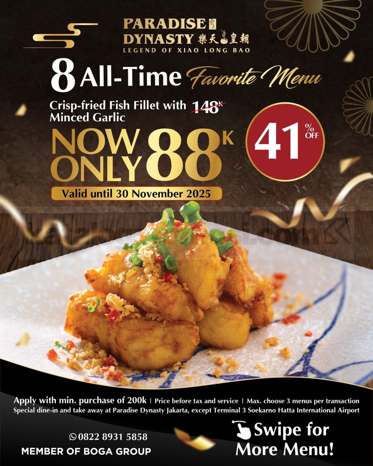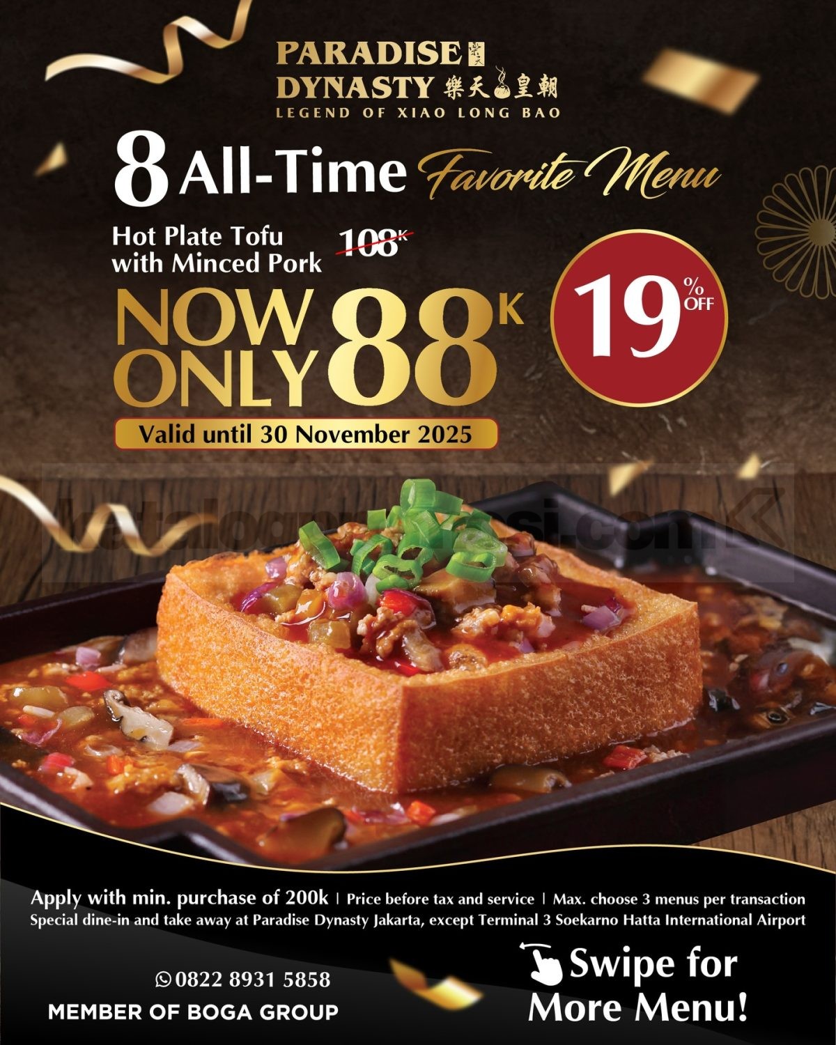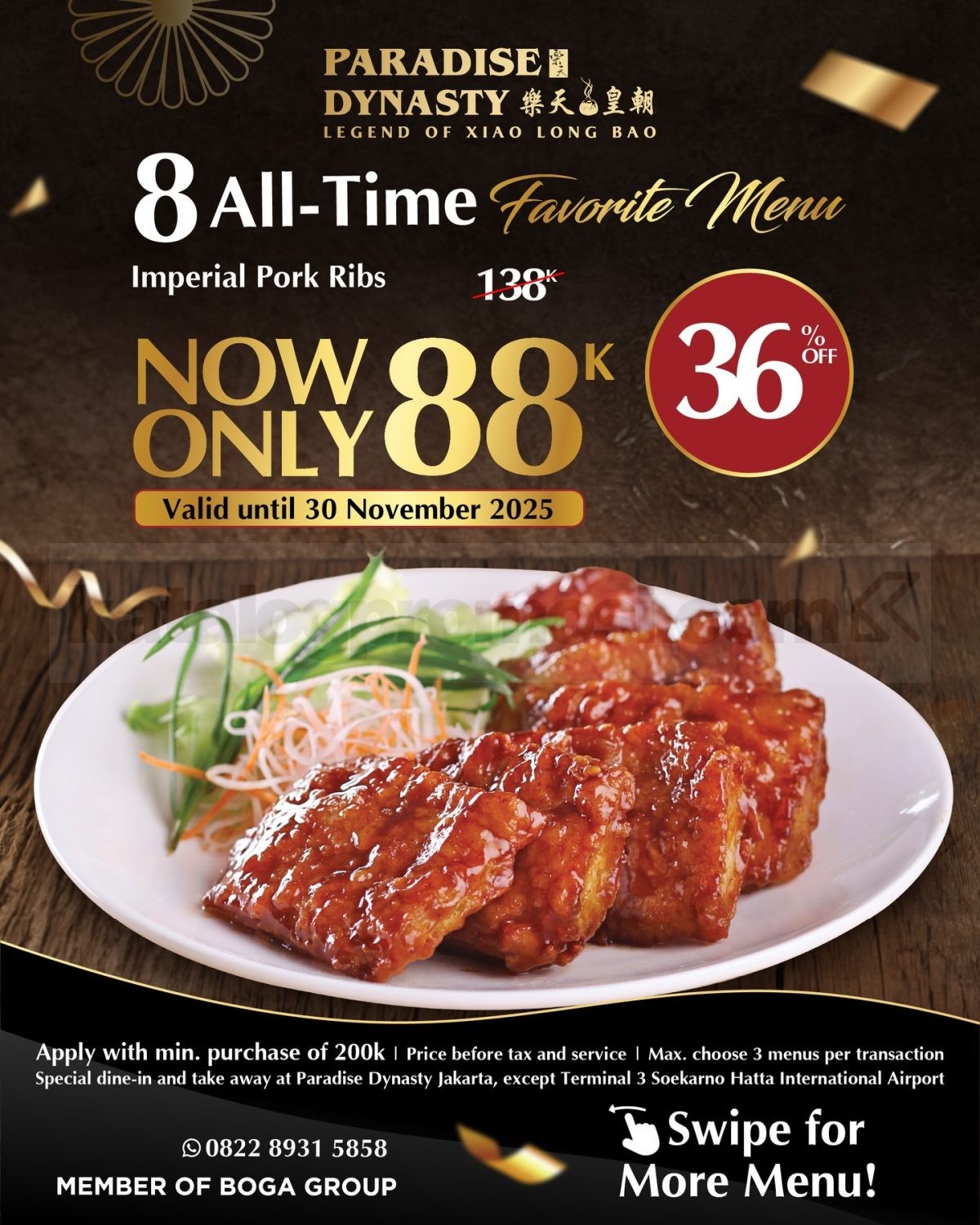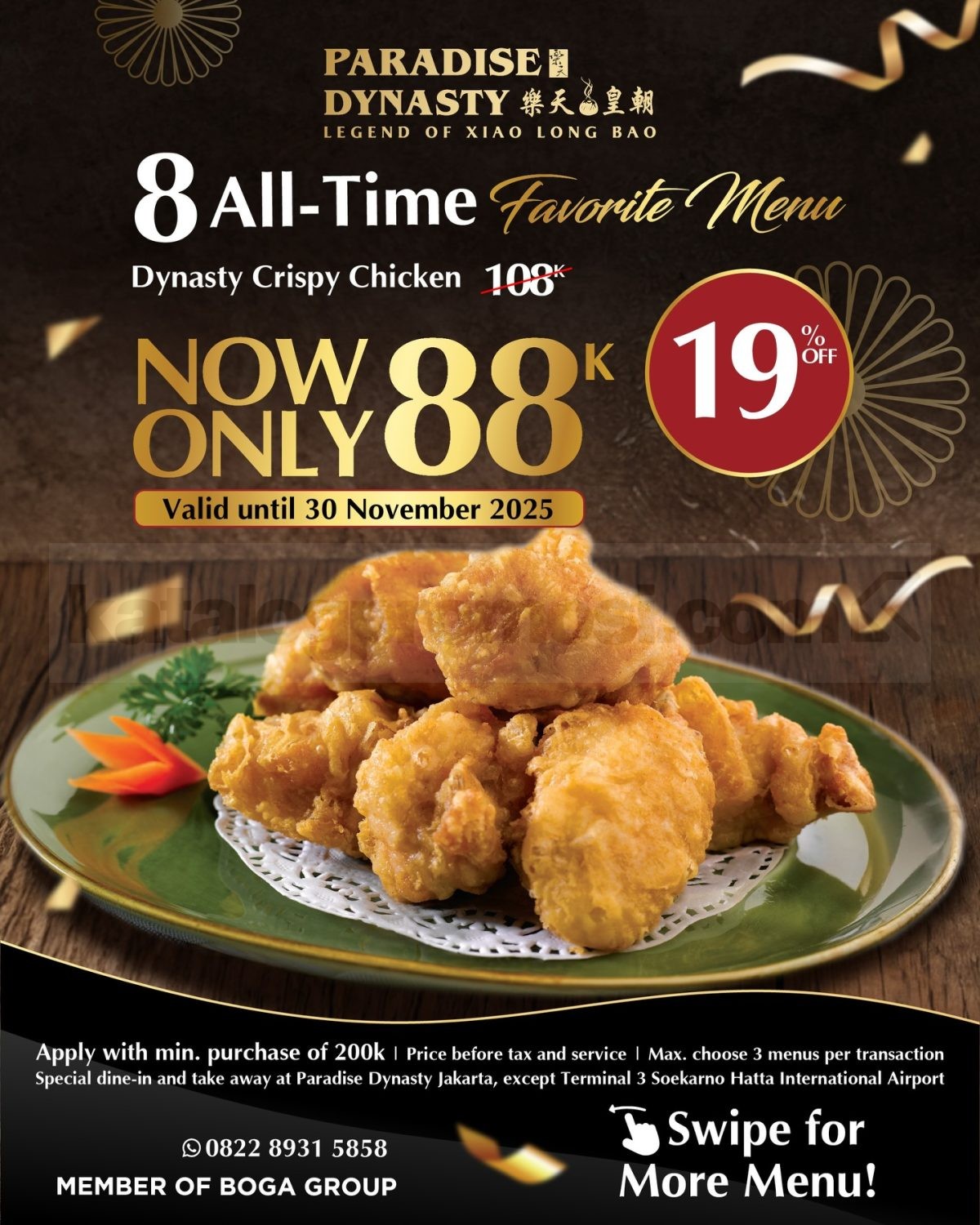 Promo Paradise Dynasty Favorite Menu Rp. 88.000 untuk 8 menu favorit dengan diskon besar, berlaku hingga 30 November 2025 di lokasi tertentu.