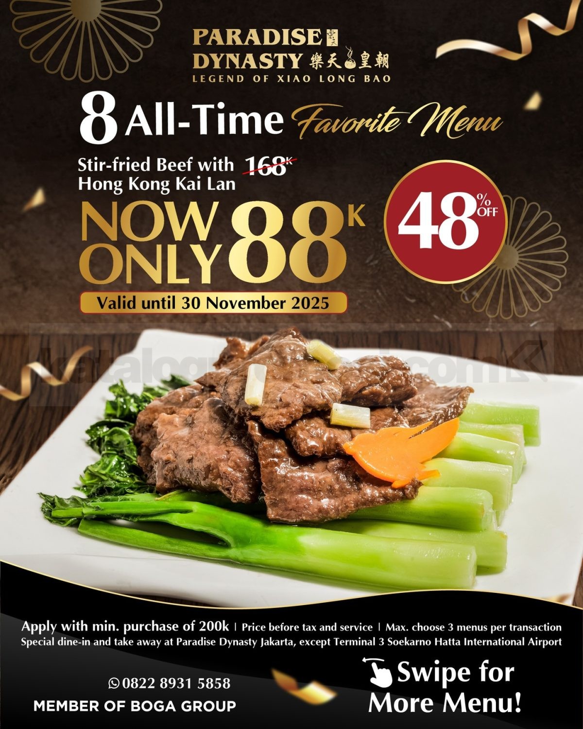 Promo Paradise Dynasty ini mencakup pilihan menu populer seperti La Mian with Poached Beef in Szechuan Style diskon 25%, Imperial Pork Ribs diskon 36%, Stir-fried Beef with Hong Kong Kai Lan diskon 48%, Hot Plate Tofu with Minced Pork diskon 19%, Braised Hor Fun with Seafood diskon 25%, Crisp-fried Fish Fillet with Minced Garlic diskon 41%, Dynasty Crispy Chicken diskon 19%, dan Xiao Long Bao Dynasty diskon 19%. Semua bisa kamu pilih dengan harga sama, yaitu Rp. 88.000 sebelum pajak dan servis.