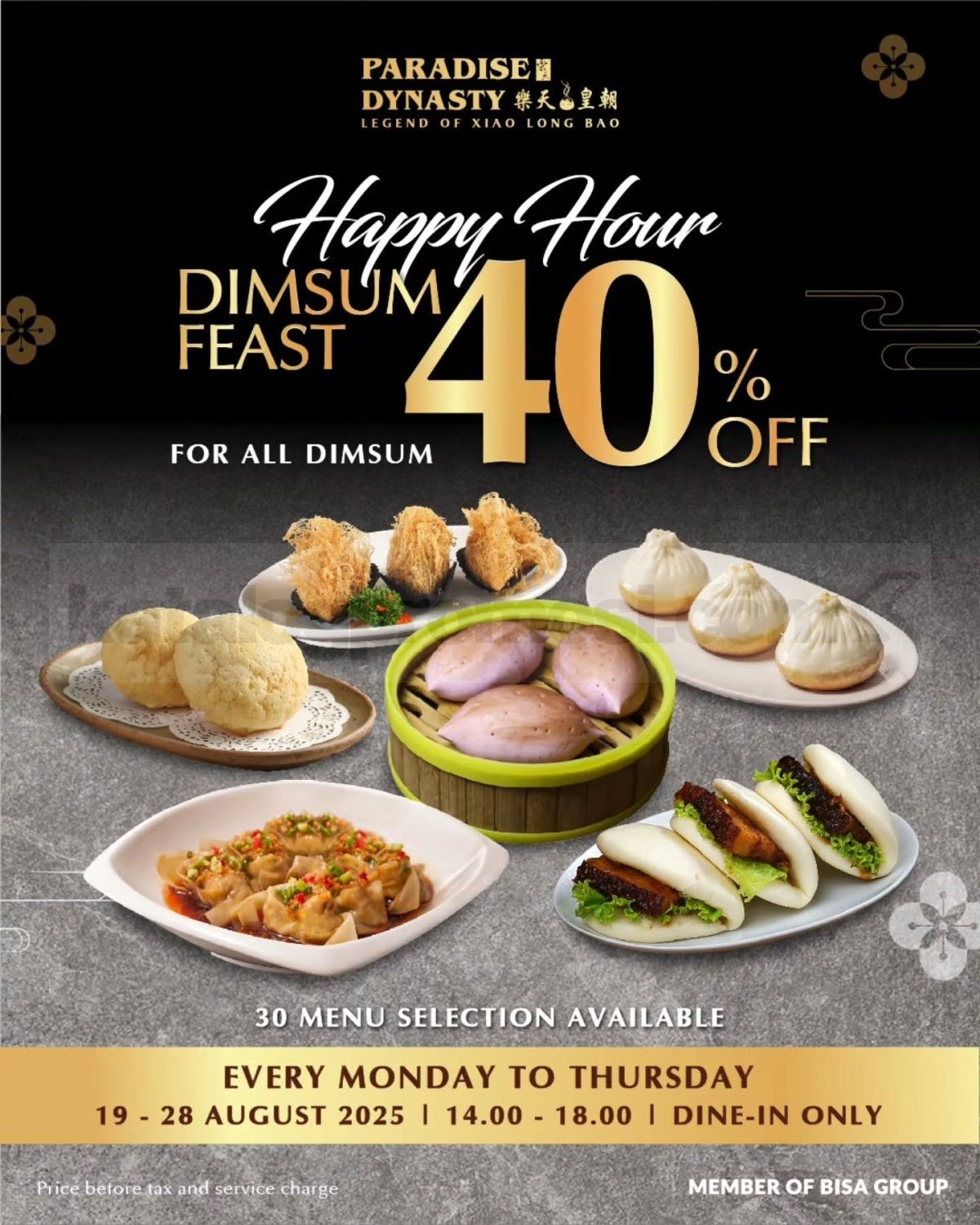 Promo Paradise Dynasty Happy Hour Dimsum Feast Diskon 40% Off*, tanggal 19–28 Agustus 2025