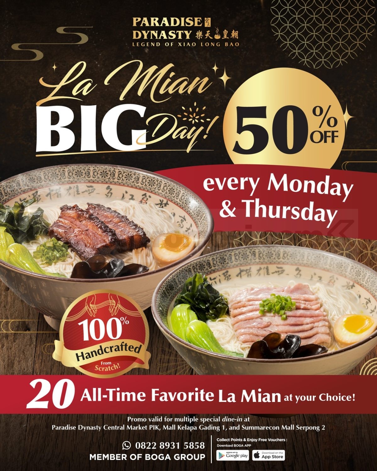 👉 Cek gambar promo Paradise Dynasty La Mian Big Day Diskon 50% di bawah ini untuk lihat informasi lengkap dan pilihan menu La Mian.