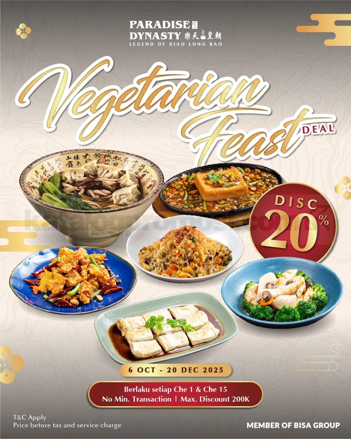 Promo Paradise Dynasty Medan Vegetarian Feast Diskon 20% berlaku 6 Oktober–20 Desember 2025 untuk semua menu vegetarian pilihan dine-in di outlet Paradise Dynasty Medan.