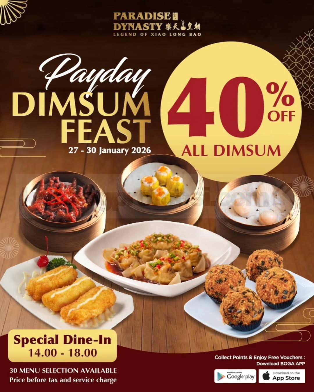 Promo Paradise Dynasty Medan Payday Dim Sum Diskon 40% untuk 30 pilihan menu dim sum, dine-in pukul 14.00–18.00, berlaku mulai tanggal 27 Januari 2026 – 30 Januari 2026 khusus outlet Medan