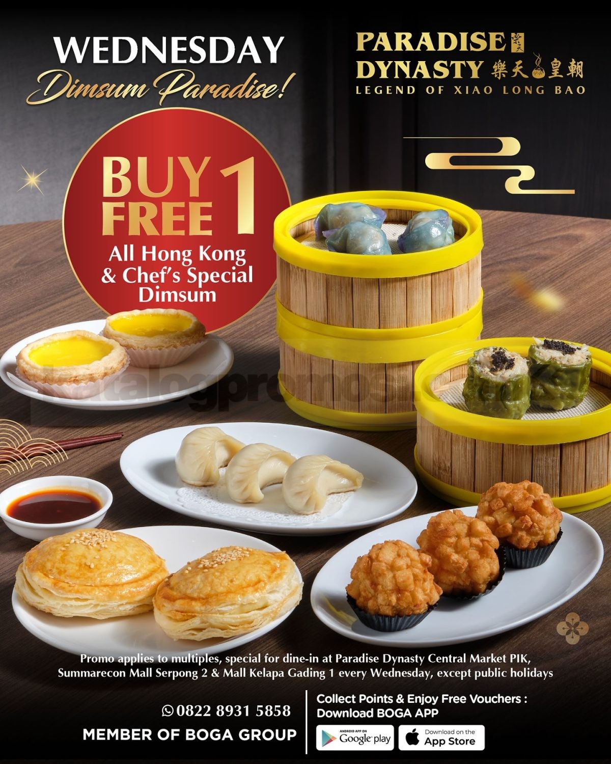 Promo Paradise Dynasty Wednesday Dimsum Buy 1 Get 1 Free untuk semua Hong Kong & Chefโs Special Dimsum berlaku setiap Rabu selama persediaan masih ada di lokasi tertentu.