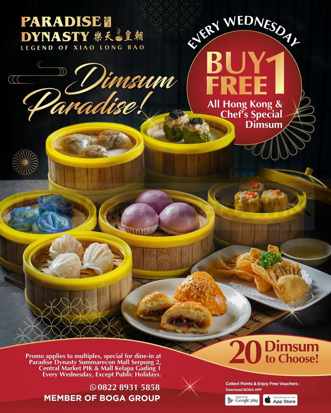 Promo Paradise Dynasty Wednesday Dimsum Buy 1 Get 1 Free ini spesial dine-in dan berlangsung setiap Rabu selama persediaan masih ada, kecuali public holidays. Pengunjung bisa menikmati langsung di beberapa lokasi pilihan seperti Summarecon Mall Serpong 2 Level 2, Central Market PIK Level 1, dan Mall Kelapa Gading 1 Ground Floor.