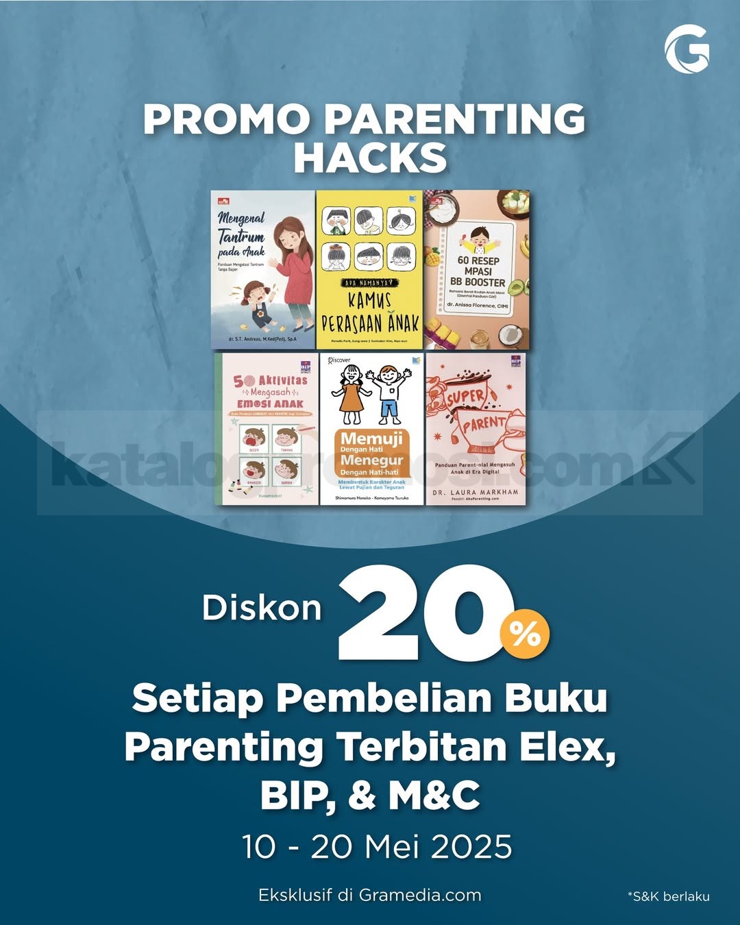 - Dapatkan diskon 20% setiap pembelian buku-buku Parenting terbitan Elex Media Komputindo, Bhuana Ilmu Populer dan M&C!