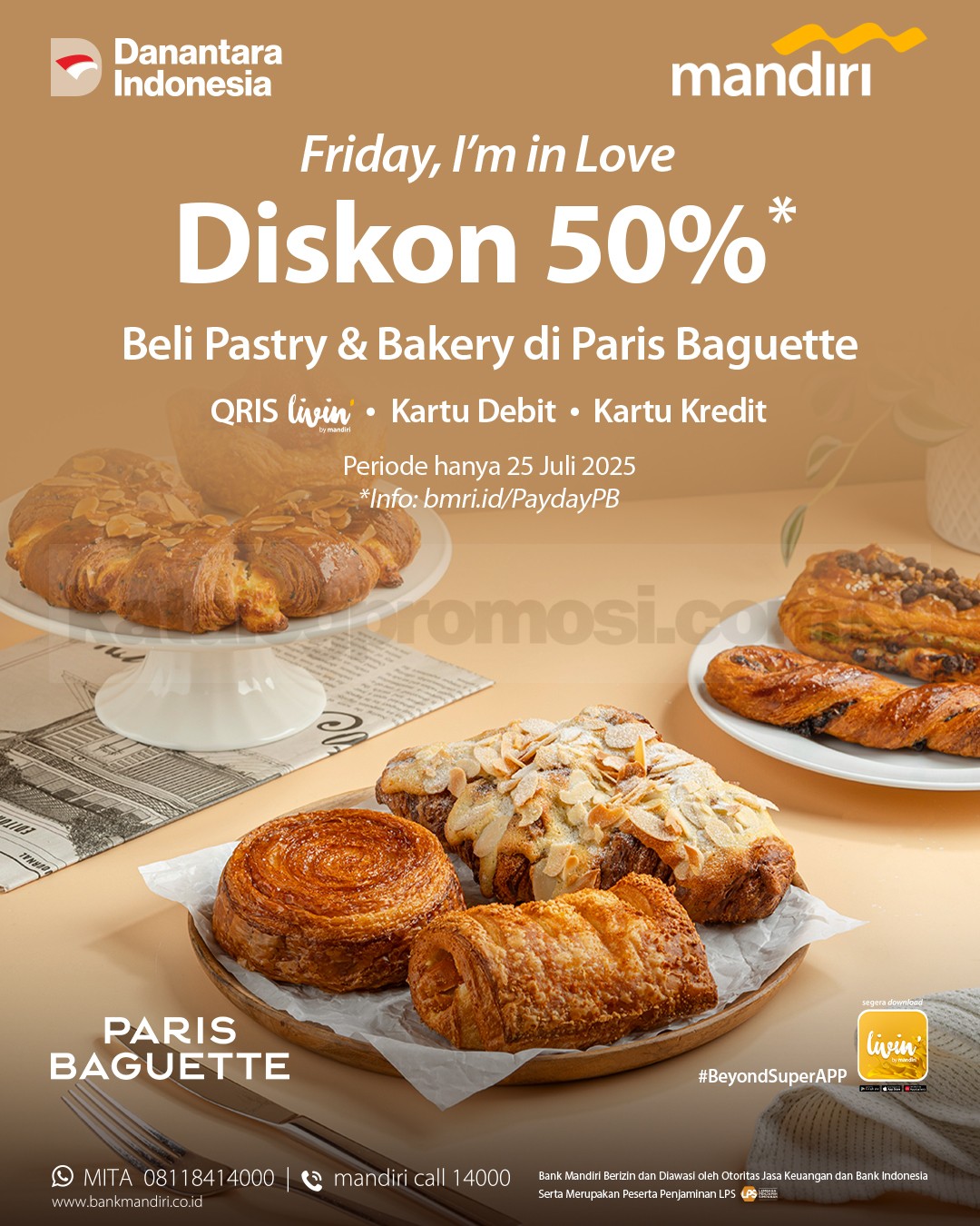 Akhiri bulan dengan promo heboh dari Paris Baguette. Yuk nikmati pastry, roti, cake, kopi, dan sandwich favorit dengan diskon 50% hanya sehari di 30 September 2025!