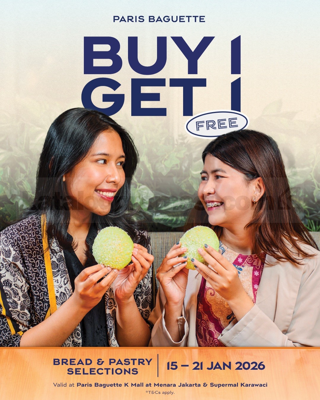 Promo Paris Baguette Grand Opening beli 1 gratis 1 roti dan pastry berlaku 15 – 21 Januari 2026 di Supermal Karawaci dan K Mall at Menara Jakarta.