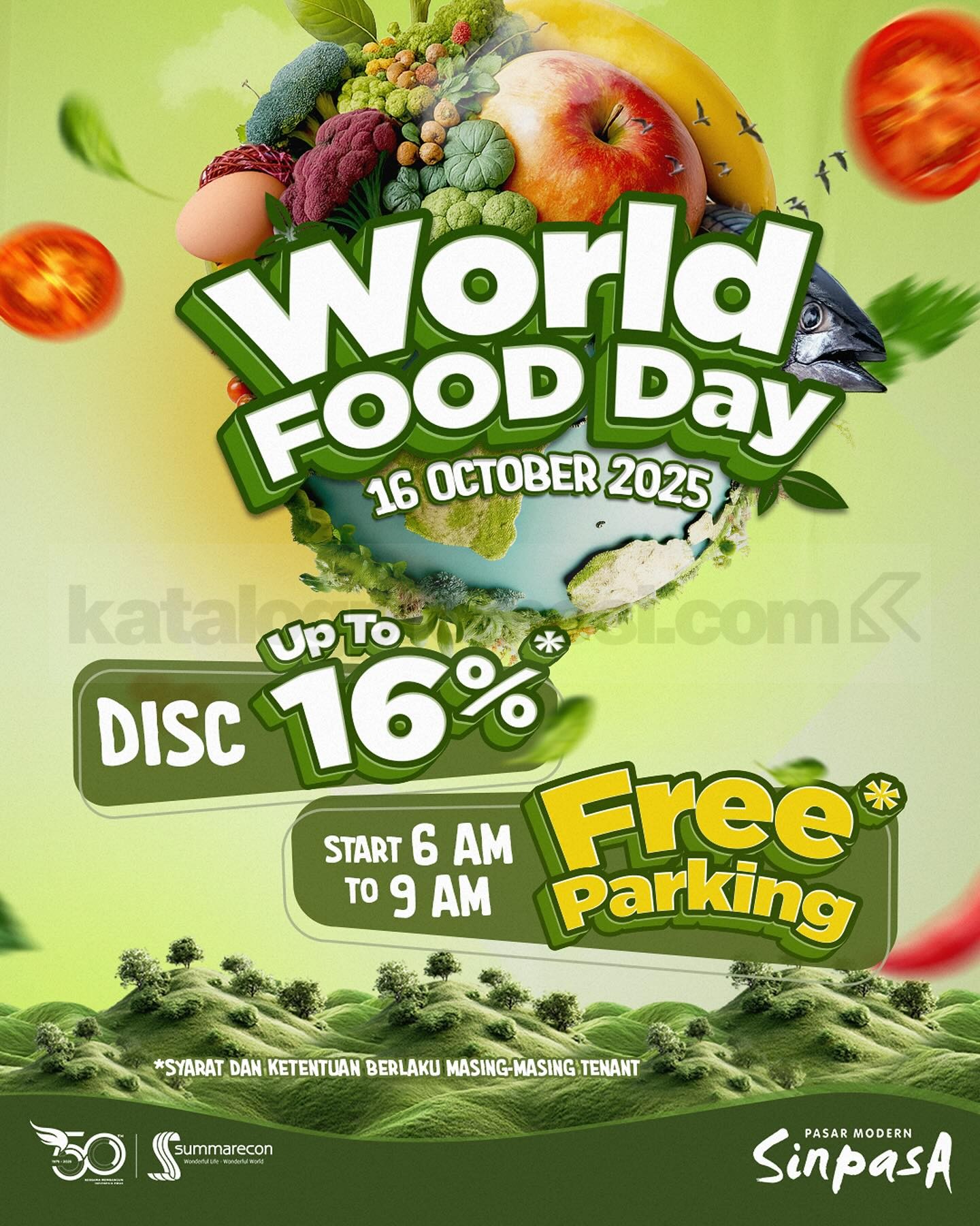 Promo Pasar Modern Sinpasa Hari Pangan Dunia diskon hingga 16% dan parkir gratis 16 Oktober 2025. Belanja hemat kebutuhan pangan & rumah tangga!