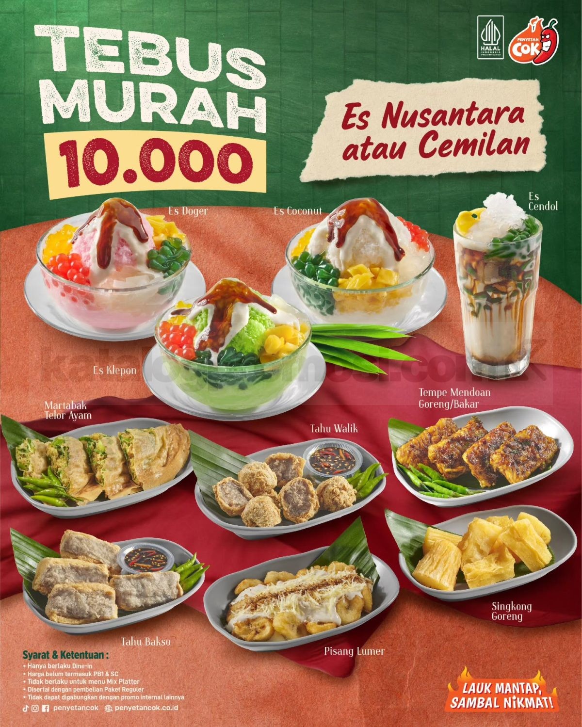 Yuk, jangan sampai kelewatan Promo Penyetan Cok Tebus Murah cuma Rp 10.000 ini! Nikmatin cemilan dan es nusantara favorit kamu dengan harga super hemat! 🎉🔥