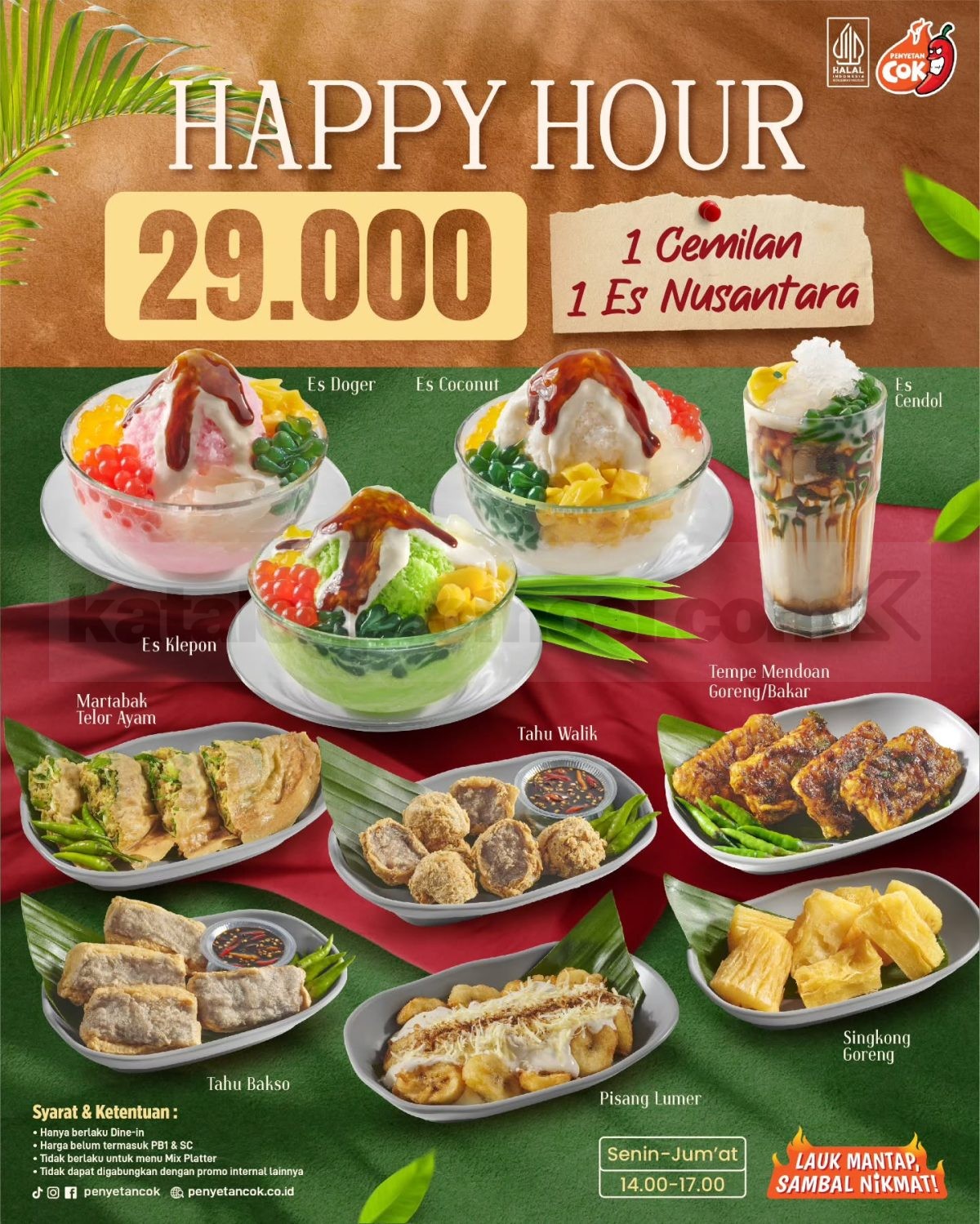 Promo berlaku hanya di outlet Penyetan Cok yang menyediakan corner “Es Nusantara” di Jabodetabek, Surabaya, dan Semarang.