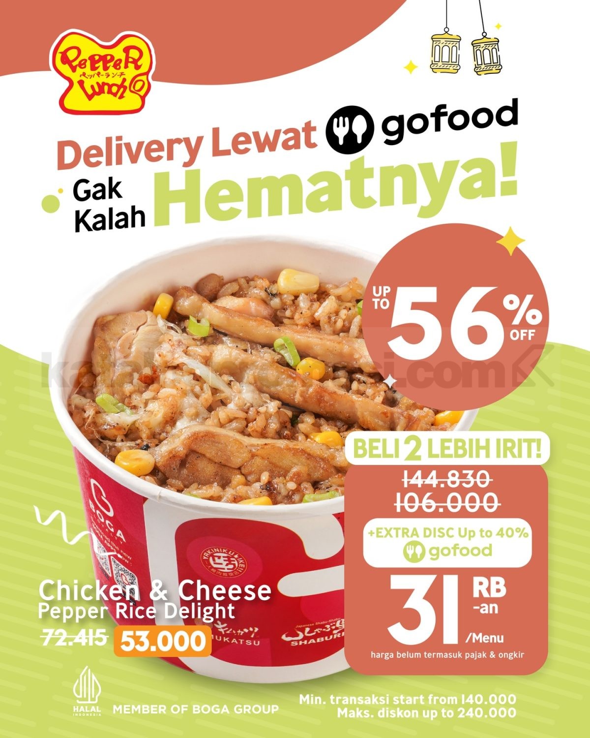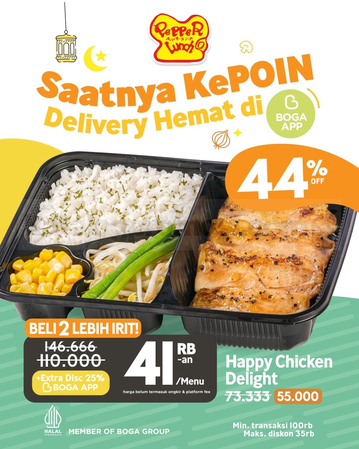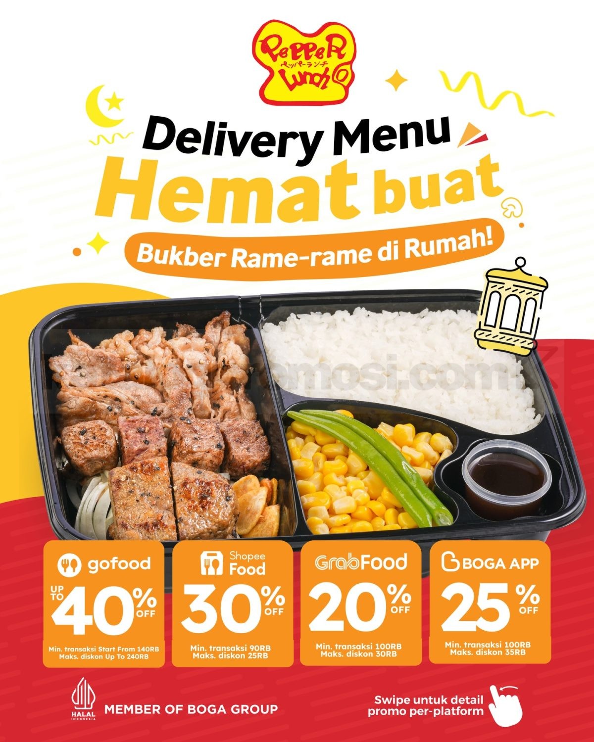 Promo Pepper Lunch Delivery diskon hingga 40% untuk pesan menu favorit via GoFood, ShopeeFood, GrabFood, dan BOGA App, berlaku selama periode promo.