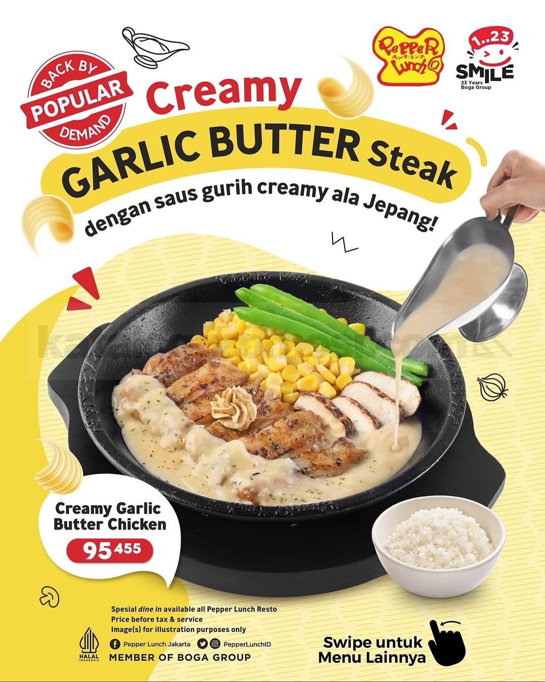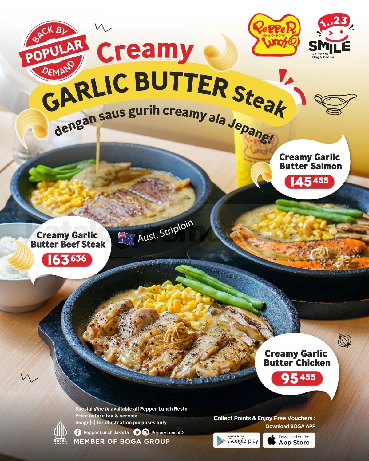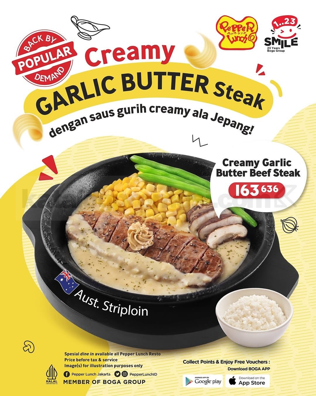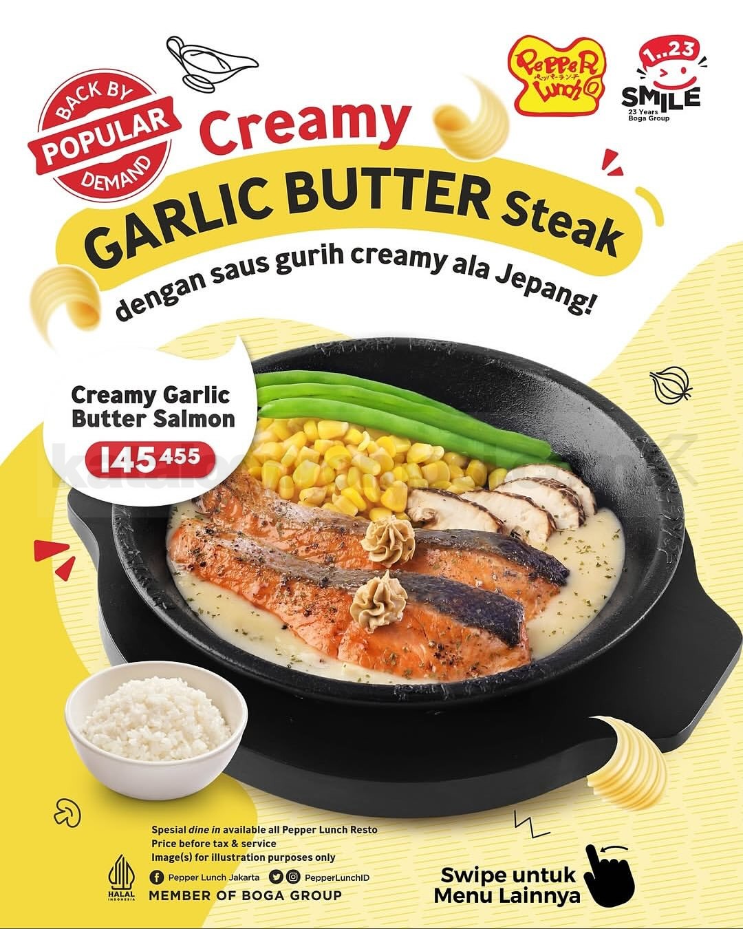 Promo Pepper Lunch Creamy Garlic Butter Steak kembali hadir dengan varian Beef, Chicken, dan Salmon, spesial Boga Anniversary ke-23, dine-in semua outlet.