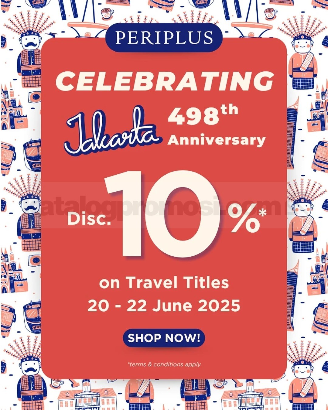 Jakarta’s 498th anniversary is the perfect time to reignite your wanderlust 📚🌏 Buat kamu yang suka eksplorasi dan budaya, Periplus kasih diskon 10% untuk koleksi buku Traveling, Indonesiana, Asiana, dan Tourism — cuma di tanggal 20–22 Juni 2025!
