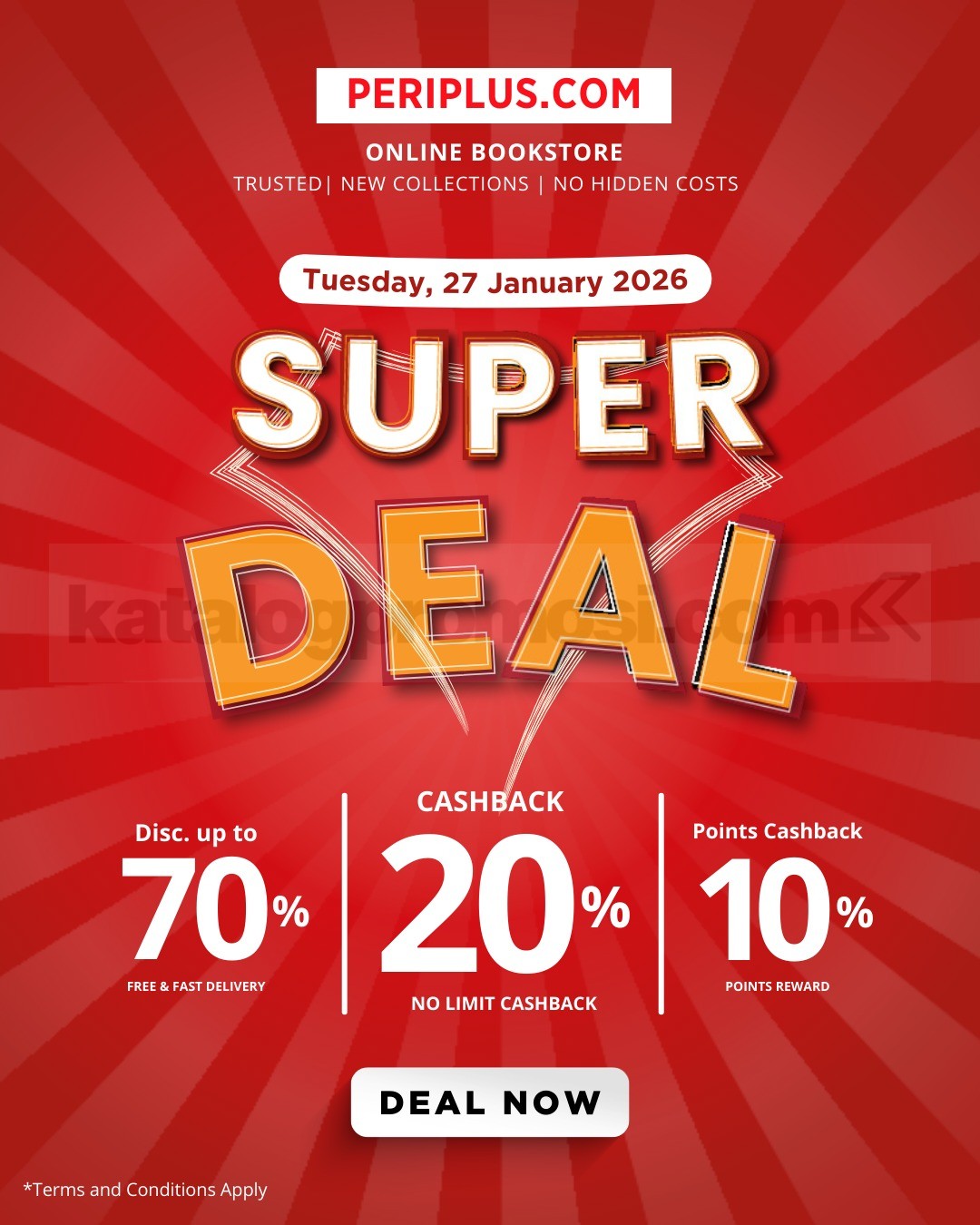 Promo Periplus Super Deal Buku Diskon hingga 70% cashback hingga 20% belanja buku impor online berlaku tanggal 27 Januari 2026 di Periplus.com.