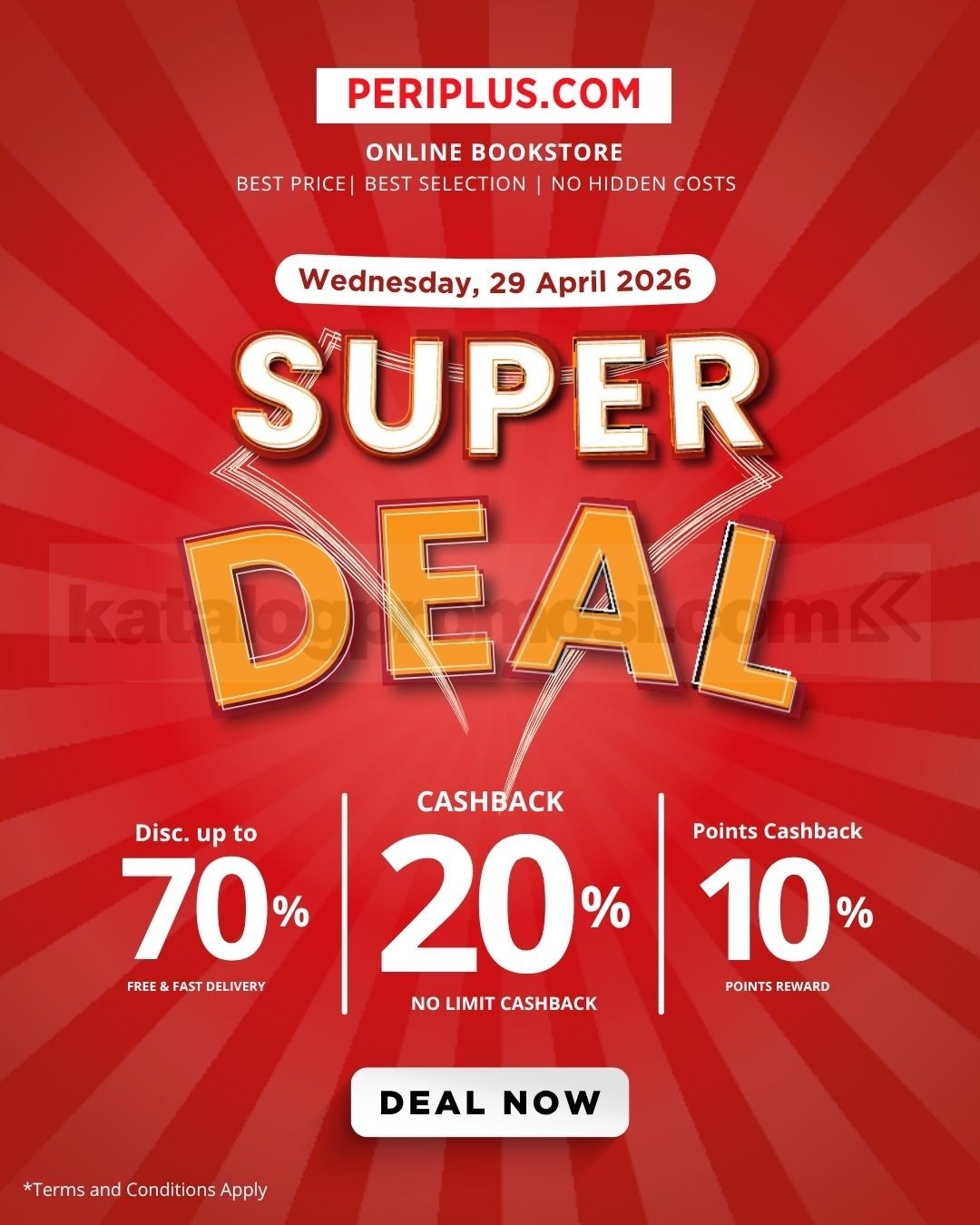 Promo Periplus Super Deal Cashback 20% Tanpa Batas hemat besar buku favorit dengan cashback 20%, diskon hingga 70%, reward poin 10%, berlaku 29 April 2026.