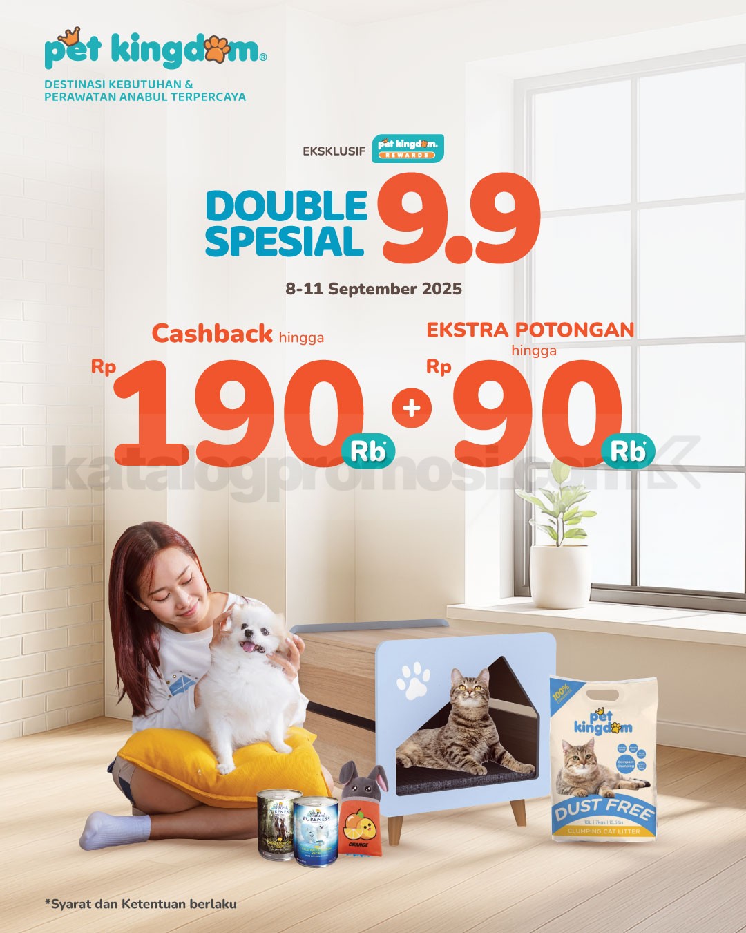 Promo Pet Kingdom 9.9 Double Spesial cashback hingga Rp190 ribu + ekstra potongan Rp90 ribu berlaku 8–11 September 2025 di seluruh outlet.