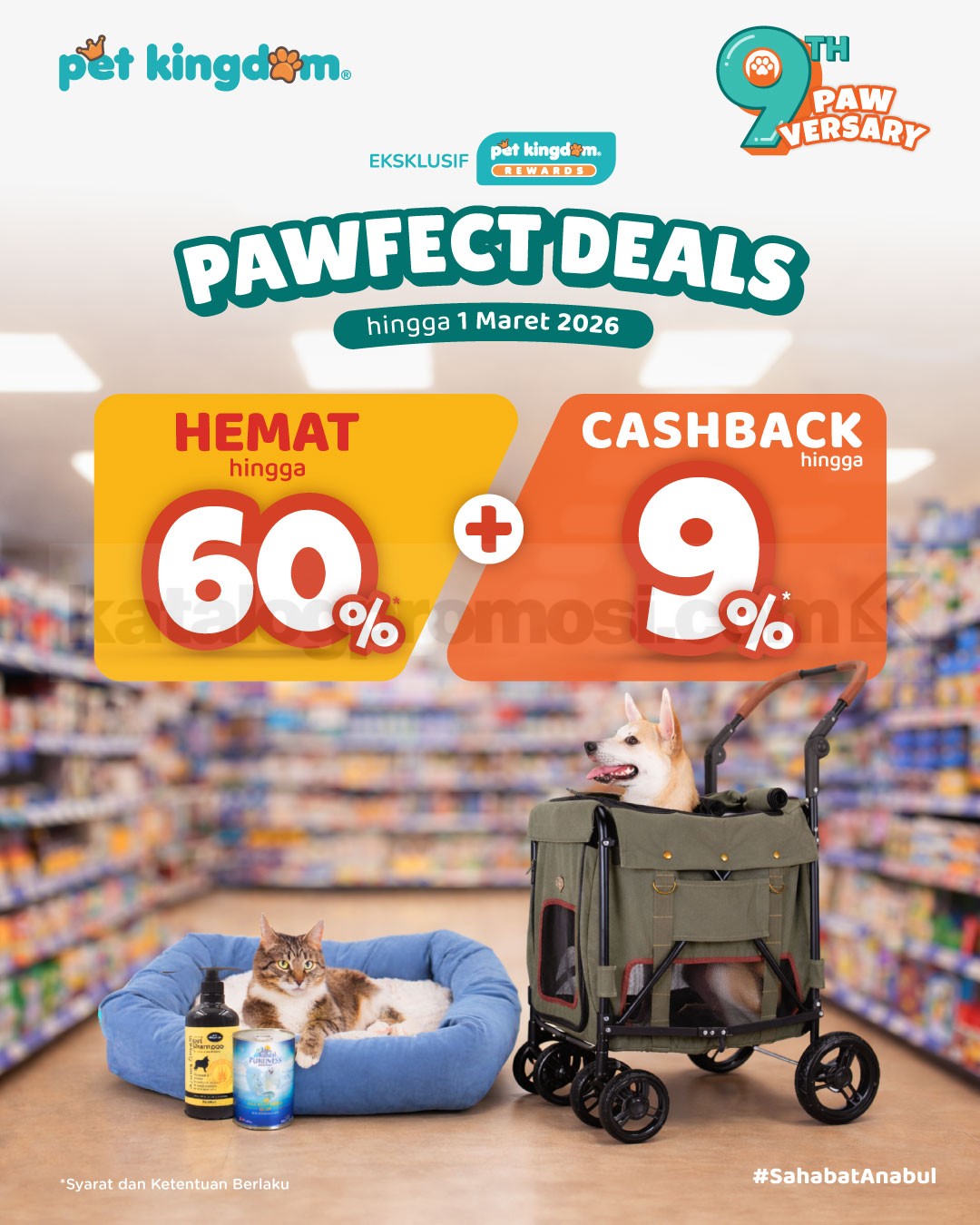 Promo Pet Kingdom PAWfect Deals diskon hingga 60% plus cashback 9% untuk member Rewards, belanja kebutuhan anabul berlaku mulai 1 Februari 2026 – 1 Maret 2026.